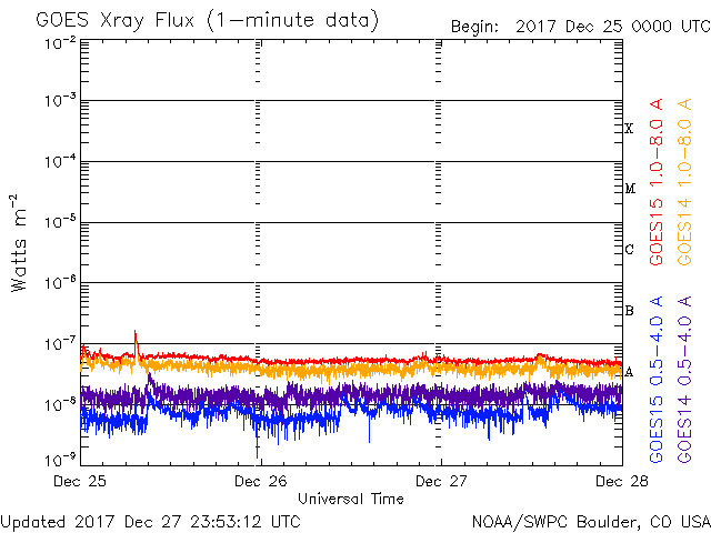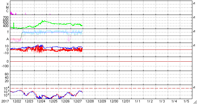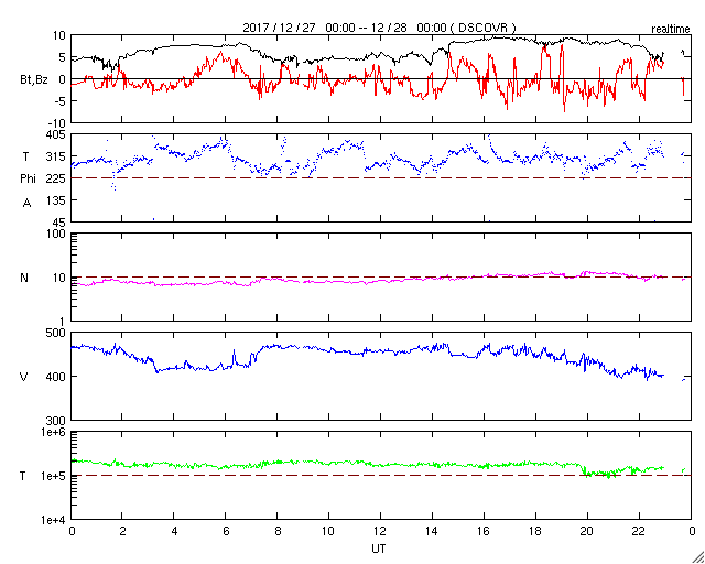 2017/12/28 08:53 更新 太陽風は平均的な速度です。太陽は無黒点になっています。 担当 篠原 昨日のニュースの後、 太陽風の速度は再び450km/秒に少し上がりましたが、 今朝に入ってまた下がり、 現在は400km/秒と平均的な状態に戻っています。 一方、磁場強度は5〜10nTとやや強まった状態が続いています。 SDO衛星AIA193の太陽コロナ写真を見ると、 南半球のコロナホールは、太陽の西の端に近付いています。 影響はこの程度で終わるのか、もうしばらく残るのか、 この後の変化にも注目して下さい。 磁気圏では、ある程度の活動が続き、 AE指数は500nTの変化が時々発生しています。 太陽風がこのまま穏やかになれば、 磁気圏も静かになっていくでしょう。 太陽は、2692黒点群が見えなくなり、 無黒点になっています。 X線グラフも変化はありません。