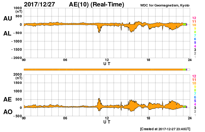 (c) SDO (NASA) ![]() SDO衛星による太陽の可視光写真 (c) SDO (NASA) ![]() DSCOVRが観測した太陽風の磁場(1番上の枠、黒線は全体の強度、赤線は南北成分) および、太陽風の密度(3番目の紫線)、速度(4番目の青線) (c) データ:NOAA/SWPC、作図:宇宙天気ニュース ![]() AE指数(速報値) 下段のAEグラフの値が高くなると、オーロラ活動が活発化しています。 (c) 京都大学WDC ![]() 27日の太陽周期に合わせたデータプロット 太陽が同じ面を地球に向けていた27日前の変化から、今後を予想することができます。 (c) 作図:宇宙天気ニュース