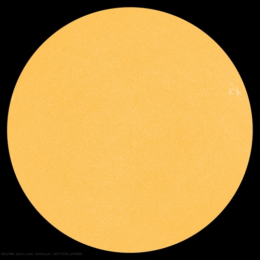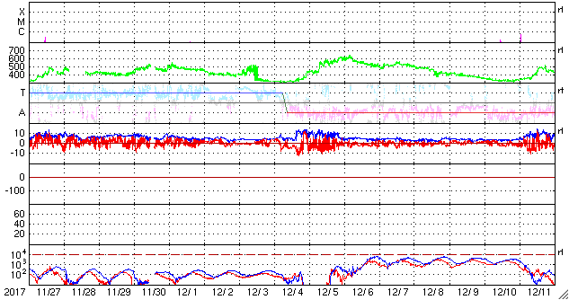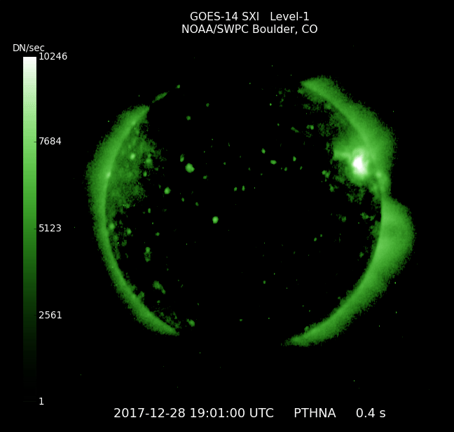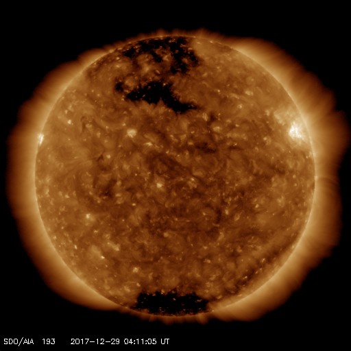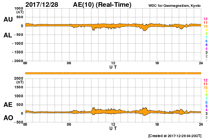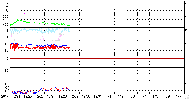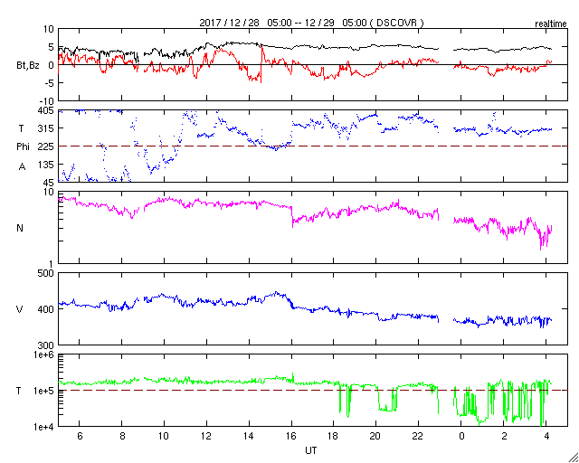 2017/12/29 13:23 更新 太陽の東端で小さいフレアが発生しました。太陽風はやや低速で穏やかです。 担当 篠原 今朝、29日9時半(世界時28日22時半)に、 太陽の東端(左端)で、B8.3の小さいフレアが発生しました。 その様子を、GOES衛星SXIカメラの動画で紹介します。 太陽の端にちょうど見え始めた時に発生しています。 このため、本当の規模はこれよりも大きかった可能性があります。 可視光写真では、黒点の姿は見えていません。 この後、見えてくるかもしれないので、注目してください。 一方、2692黒点群は見えなくなったままで、 現在の太陽は無黒点です。 太陽風の速度は、昨日いっぱいは400km/秒台を保っていましたが、 その後、低下を始めて、現在は370km/秒とやや低速です。 磁場強度は、5nTと平均的な値で安定しています。 コロナホールの影響は通り過ぎて、太陽風は穏やかになっています。 太陽風磁場の南北成分は、0nT付近で小さく変化しています。 速度が下がってきたこともあり、磁気圏は概ね静穏で、 AE指数は小さい変化が時々起きている程度です。 SDO衛星AIA193では、北半球の中緯度域にコロナホールが見えています。 27日前の前周期は、この領域の影響で、 600km/秒に達する高速の太陽風が、12月5日に到来しました。 今回は、コロナホールの広がりが高緯度側に動いていて、 地球への影響は弱まる可能性があります。 変化の始まりは、1月1日頃になりそうです。 新年最初のオーロラの高まりをもたらすかもしれません。