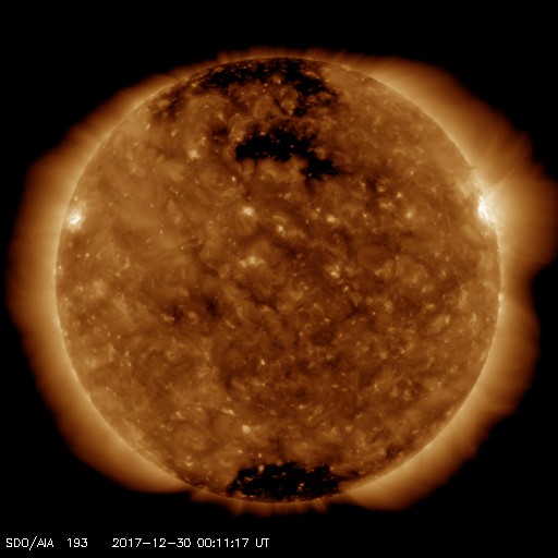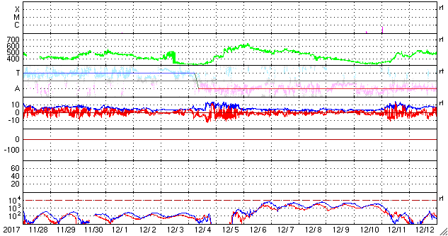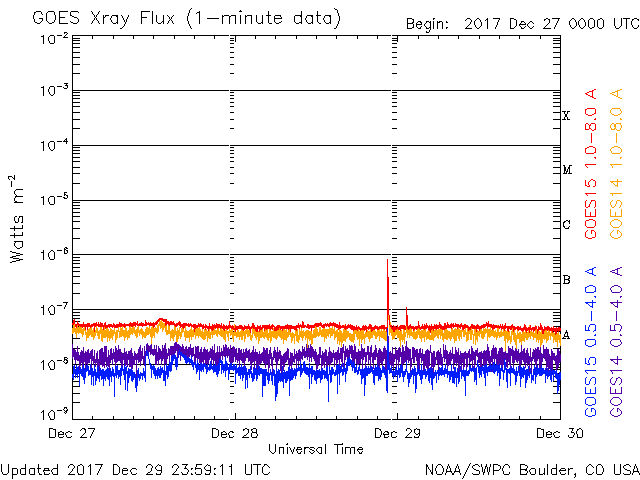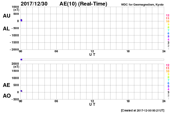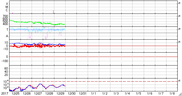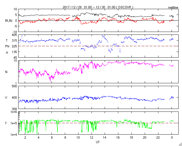 2017/12/30 09:28 更新 太陽の東端に小さい黒点が現れました。太陽風は平均的な状態です。 担当 篠原 昨日、太陽の東端でB8の小さいフレアを起こした領域は、 今日の可視光写真では、白斑として見えています。 SDO衛星の拡大写真を見ると、とても小さい黒点が見えていますが、 群番号が付けられるかどうかは分かりません。 B8以降は目立った活動もなく、 X線のグラフは静かになっています。 太陽風は、昨夜にかけて速度が400km/秒にやや上がり、 そのまま安定しています。 磁場強度も、5nT前後で安定していて、 太陽風は平均的な状態です。 磁場の南北成分は、0nT付近で小さく変化する程度です。 磁気圏は静穏で、AE指数のグラフには、 目立った変化はありません。 SDO衛星AIA193の太陽コロナ写真では、 北半球のコロナホールが太陽の中央線を通過しています。 明後日くらいに影響が到来するでしょうか。 ![]() SDO衛星のAIA193カメラによる太陽コロナの様子 (c) SDO (NASA) ![]() SDO衛星による太陽の可視光写真。マウスの矢印を写真に重ねると、黒点番号付きの写真に切り替わります。 (c) SDO (NASA) ![]() GOES衛星の太陽X線データ (c) NOAA/SWPC ![]() DSCOVRが観測した太陽風の磁場(1番上の枠、黒線は全体の強度、赤線は南北成分) および、太陽風の密度(3番目の紫線)、速度(4番目の青線) (c) データ:NOAA/SWPC、作図:宇宙天気ニュース ![]() AE指数(速報値) 下段のAEグラフの値が高くなると、オーロラ活動が活発化しています。 (c) 京都大学WDC ![]() ![]() 27日の太陽周期に合わせたデータプロット 太陽が同じ面を地球に向けていた27日前の変化から、今後を予想することができます。 (c) 作図:宇宙天気ニュース