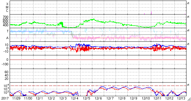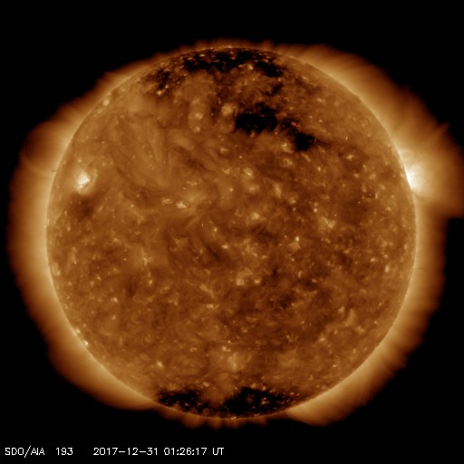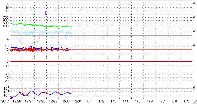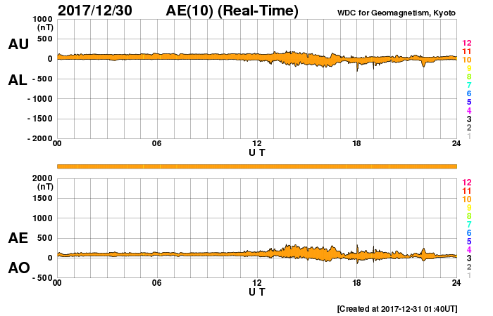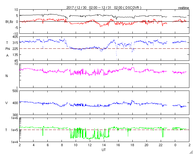 2017/12/31 10:43 更新 太陽風はやや低速になり、磁気圏も穏やかです。太陽は無黒点です。 担当 篠原 太陽風の速度は、400km/秒から370km/秒へ下がり、 やや低速になっています。 磁場強度も、5nTから4nTへ下がり気味です。 穏やかな太陽風が続いています。 磁気圏も静穏で、 AE指数のグラフは、小さい変化が見られる程度です。 27日周期の図を見ると、 前周期の12月4日に、 太陽風磁場の大まかな方向の切り替わりが到来して、 セクターのグラフが T から A に変化しています。 この切り替わりが、今日か明日くらいに回帰しそうです。 前周期の太陽風では、この切り替わりに続いて、 磁場強度の高まりが到来し、速度の上昇も始まっています。 今回も同様の推移をする可能性があり、 DSCOVER衛星の太陽風のグラフと、 この27日周期のグラフを見比べながら、 今後の変化に注目して下さい。 磁場強度が高まって、南北成分が大きく南に変化すると、 オーロラの活動も高まります。 今年最後の高まりと、新年最初の高まりが、 まとめてやって来るかもしれません。 太陽の東端に現れた領域は、それ以上発達することはなく、 現在は小さい黒点も見えなくなっています。 X線のグラフも変化はなく、太陽はとても穏やかです。 とうとう大晦日になりました。 今年も宇宙天気ニュースをお読みいただきありがとうございました。 どうぞ良いお年をお迎え下さい。 ![]() SDO衛星のAIA193カメラによる太陽コロナの様子 (c) SDO (NASA) ![]() SDO衛星による太陽の可視光写真 (c) SDO (NASA) ![]() DSCOVRが観測した太陽風の磁場(1番上の枠、黒線は全体の強度、赤線は南北成分) および、太陽風の密度(3番目の紫線)、速度(4番目の青線) (c) データ:NOAA/SWPC、作図:宇宙天気ニュース ![]() AE指数(速報値) 下段のAEグラフの値が高くなると、オーロラ活動が活発化しています。 (c) 京都大学WDC ![]() ![]() 27日の太陽周期に合わせたデータプロット 太陽が同じ面を地球に向けていた27日前の変化から、今後を予想することができます。 (c) 作図:宇宙天気ニュース