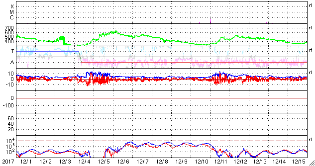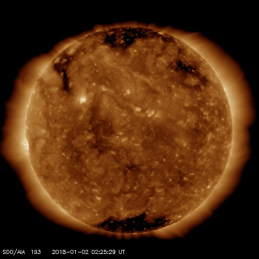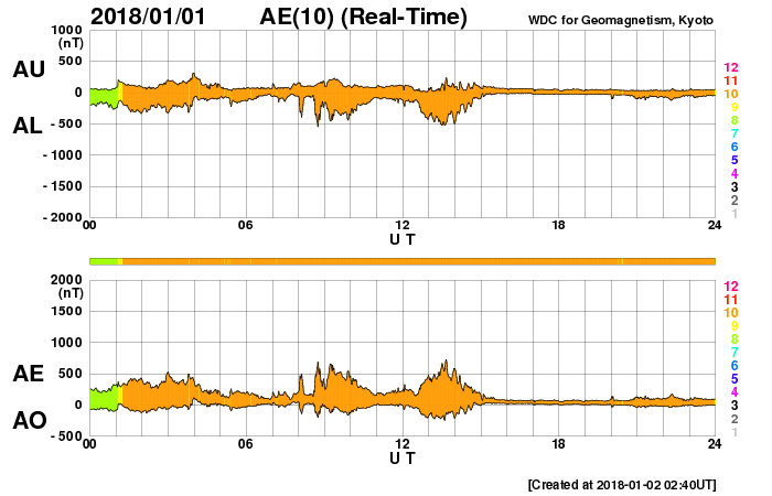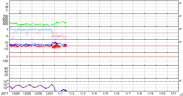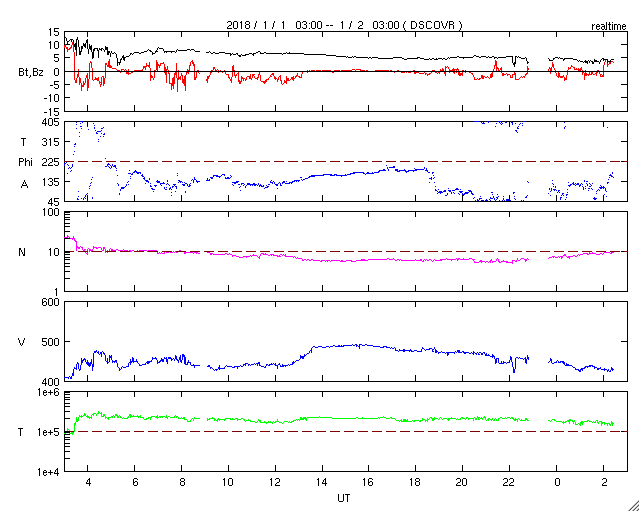 2018/ 1/ 2 11:40 更新 太陽風の高まりは終わり、磁気圏は穏やかです。 担当 篠原 太陽風の速度は、昨日の午後に450km/秒に上がり、 深夜には500km/秒近くまで高まりました。 しかし、すぐに下がり始めて、 現在は420km/秒と平均的な状態に戻っています。 磁場強度も、昨日は10nTに強まっていましたが、 以降はゆっくりと低下が続き、 こちらも、5nTと平均的な値まで下がっています。 コロナホールの影響は、 今回はだいぶ弱くなってしまった様です。 AE指数のグラフも、 前半は500nT程度の中規模の活動が見られますが、 後半は静かになり、現在の磁気圏は穏やかです。 SDO衛星AIA193の太陽コロナ写真では、 太陽の中央部にはコロナホールはなく、 太陽風はしばらく穏やかな状態が続きそうです。 太陽は、現在は無黒点ですが、 東端に活動的な領域が近付いている様です。 今後、新しい黒点が姿を現すかもしれません。
