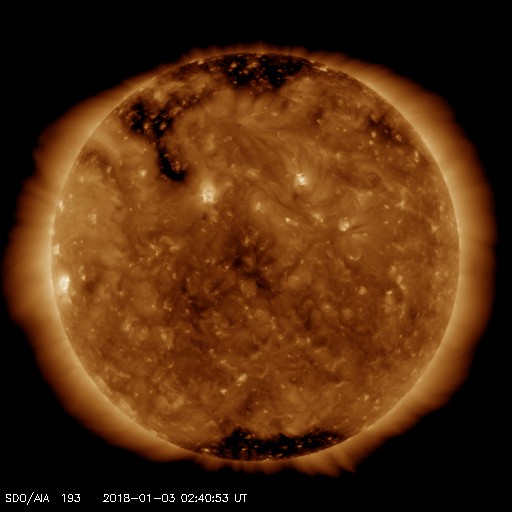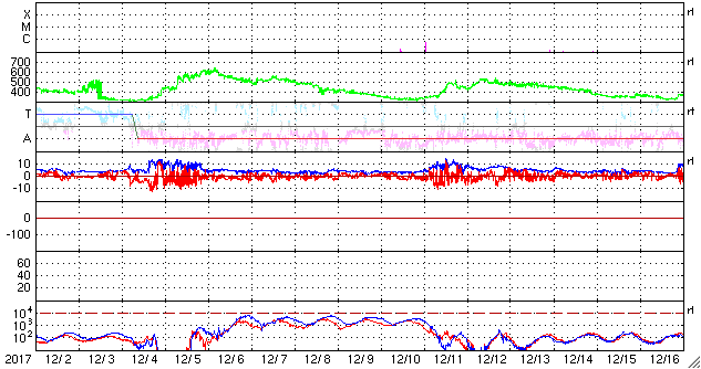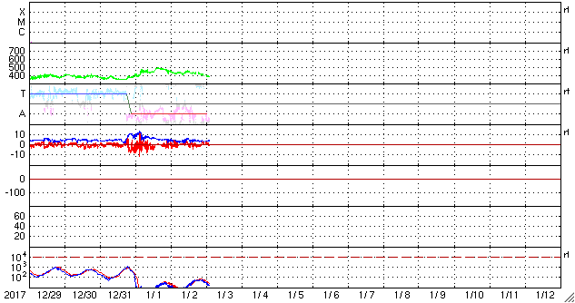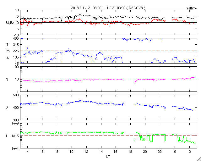 2018/ 1/ 3 11:54 更新 太陽風はやや低速になっています。太陽は無黒点です。 担当 篠原 太陽風の速度は、今朝にかけて420km/秒で安定していましたが、 その後、下がり始め、 現在は380km/秒と低速の風になりかけています。 磁場強度も、3〜4nTとやや弱くなっています。 SDO衛星AIA193の太陽コロナ写真では、 太陽の中央部から西側(右側)にかけてコロナホールはなく、 今後の太陽風は、低速の穏やかな風になりそうです。 一方、東側(左側)の中緯度域には、 次のコロナホールが斜めに伸びています。 この領域は前周期もあり、 27日周期の図の12月11日から始まる高速太陽風をもたらしました。 しかし、現在のコロナホールは、 前回よりも低緯度側への広がりが小さくなっていて、 地球への影響は弱まるかもしれません。 太陽風磁場の南北成分は、0nT付近で小さく変化しています。 磁気圏は概ね静穏で、 AE指数は、一時的に小さい高まりが発生している程度です。 太陽は無黒点です。 昨日注目していた東端の領域は、 可視光写真で白斑として見えていますが、 黒点はありませんでした。