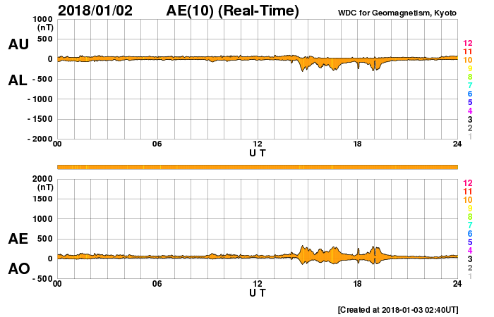(c) SDO (NASA) ![]() SDO衛星による太陽の可視光写真 (c) SDO (NASA) ![]() DSCOVRが観測した太陽風の磁場(1番上の枠、黒線は全体の強度、赤線は南北成分) および、太陽風の密度(3番目の紫線)、速度(4番目の青線) (c) データ:NOAA/SWPC、作図:宇宙天気ニュース ![]() AE指数(速報値) 下段のAEグラフの値が高くなると、オーロラ活動が活発化しています。 (c) 京都大学WDC ![]() ![]() 27日の太陽周期に合わせたデータプロット 太陽が同じ面を地球に向けていた27日前の変化から、今後を予想することができます。 (c) 作図:宇宙天気ニュース