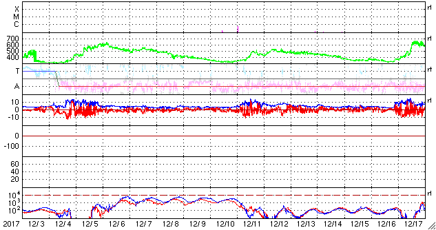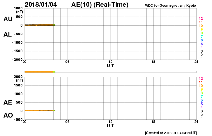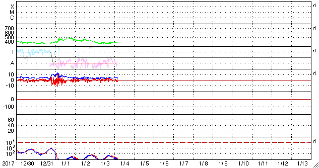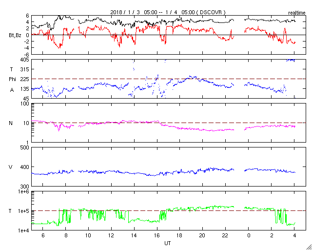 2018/ 1/ 4 13:20 更新 太陽風は平均的な状態です。ニュージーランドのグリーンフラッシュをどうぞ。 担当 篠原 ニュージーランドの中村太一さんより、 初日の出に発生した、グリーンフラッシュの写真をいただきました。 宇宙天気の現象ではありませんが、美しい太陽の姿をご覧下さい。 グリーンフラッシュ (Wikipediaのページ)は、 日の出や日没の時、低くなった太陽の光が地球の大気で屈折して、 部分的に緑色の光が強く見える現象です。 地平線や水平線に沈むまで太陽が見渡せて、 空気の透明度も高いことが必要など、条件が厳しくて、 なかなか見ることができません。 (私はまだ見たことがなく、憧れの現象です) 中村さんによると、元旦の朝の6時頃、 ダニーデンのビーチでこの現象を捉えたとのことです。 太陽の上の端に緑色の光が写っています。 日が昇る間に、緑の光が2回見えたそうで、 拡大写真、連続写真、それぞれ2枚掲載しています。 南半球のニュージーランドは今は夏で、 太陽が上がった後は、半袖でちょうど良いくらいだそうです。 素敵な一年の始まりですね。 とても貴重な写真を、どうもありがとうございます。 現在の太陽風は、速度は380km/秒、磁場強度は5nTと、 平均的な状態になっています。 磁場の南北成分は、全体としてはやや北寄りになっていて、 磁気圏は穏やかですが、 時々、磁場が南向きに変化した時に、 AE指数にも小さい変化起きています。 SDO衛星AIA193の太陽コロナ写真を見ると、 北半球のコロナホールの先頭が、太陽の中心線に達しています。 3日後の7日くらいから、太陽風の高まりが到来するかもしれません。 太陽では、北西部に新しい黒点が出現しています。 2018年の初黒点です。 X線グラフは特に変化はなく、 太陽は穏やかです。 ![]() ニュージーランド南島ダニーデンの2018年の初日の出。 (c) 中村太一氏 ![]() ニュージーランド南島ダニーデンで、現地1日6時頃に発生したグリーンフラッシュ。1回目。 (c) 中村太一氏 ![]() ニュージーランド南島ダニーデンで、現地1日6時頃に発生したグリーンフラッシュ。2回目。 (c) 中村太一氏 ![]() ニュージーランド南島ダニーデンで、現地1日6時頃に発生したグリーンフラッシュ。1回目。 (c) 中村太一氏 ![]() ニュージーランド南島ダニーデンで、現地1日6時頃に発生したグリーンフラッシュ。2回目。 (c) 中村太一氏 ![]() SDO衛星のAIA193カメラによる太陽コロナの様子 (c) SDO (NASA) ![]() SDO衛星による太陽の可視光写真。マウスの矢印を写真に重ねると、黒点番号付きの写真に切り替わります。 (c) SDO (NASA) ![]() DSCOVRが観測した太陽風の磁場(1番上の枠、黒線は全体の強度、赤線は南北成分) および、太陽風の密度(3番目の紫線)、速度(4番目の青線) (c) データ:NOAA/SWPC、作図:宇宙天気ニュース ![]() AE指数(速報値) 下段のAEグラフの値が高くなると、オーロラ活動が活発化しています。 (c) 京都大学WDC ![]() ![]() 27日の太陽周期に合わせたデータプロット 太陽が同じ面を地球に向けていた27日前の変化から、今後を予想することができます。 (c) 作図:宇宙天気ニュース