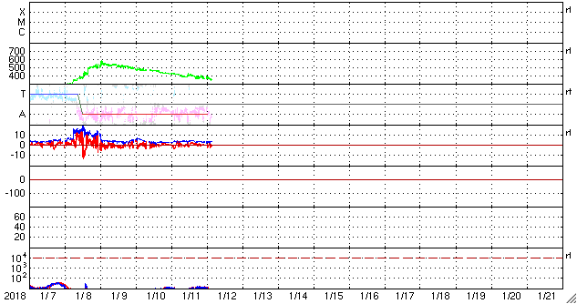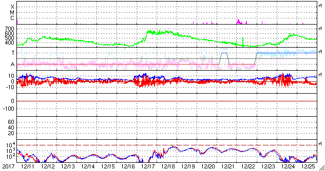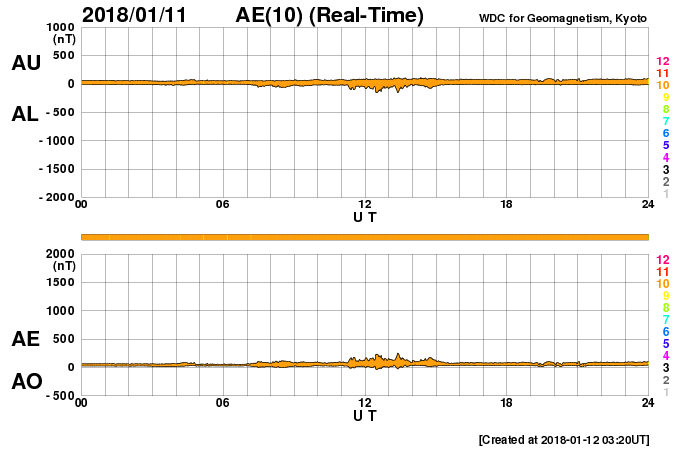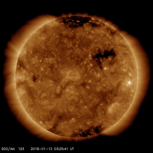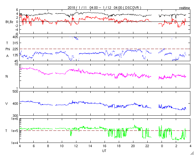 2018/ 1/12 12:31 更新 太陽風は低速で、磁気圏も穏やかです。今後コロナホールの影響が始まりそうです。 担当 篠原 太陽風の速度は350km/秒に下がり、 低速の風になっています。 磁場強度も、3〜4nTとやや弱い値で安定しています。 磁場の南北成分は、 0nT付近か、弱い北向きになる時間帯が多く、 磁気圏は静穏です。 SDO衛星AIA193の太陽コロナ写真では、 コロナホールは、 地球に影響が及び始める目安の位置に近づいています。 27日周期の図を参考にすると、 もう1日くらいかかりそうですが、 これから太陽風の高まりが到来する可能性があります。 太陽では、2694黒点群が見えなくなり、 その隣りに見えていた黒点に、2695群と番号が付きましたが、 掲載の可視光写真では、ほとんど見つけることができません。 X線グラフも変化はなく、太陽はとても穏やかです。