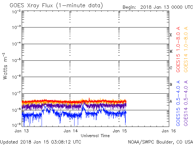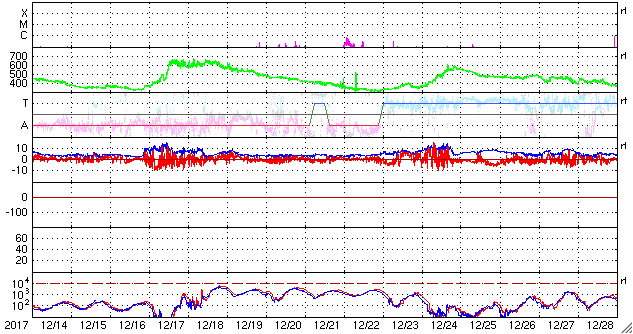 2018/ 1/11 12:26 太陽風は平均的な速度に戻っています。12月の黒点相対数は 8.2 でした。