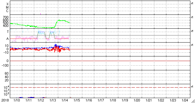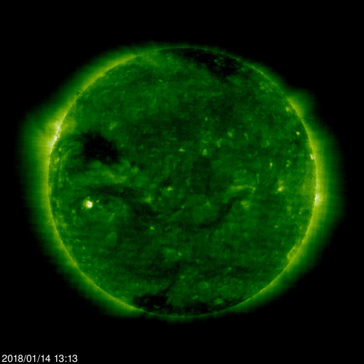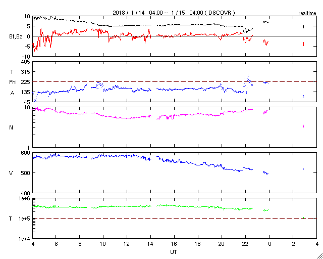 2018/ 1/14 12:00 高速太陽風が到来し、速度は600km/秒に上昇しています。