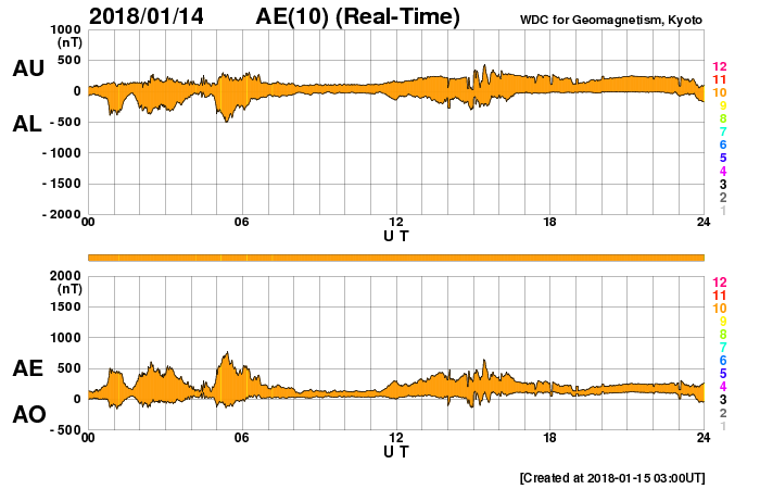 下段のAEグラフの値が高くなると、オーロラ活動が活発化しています。