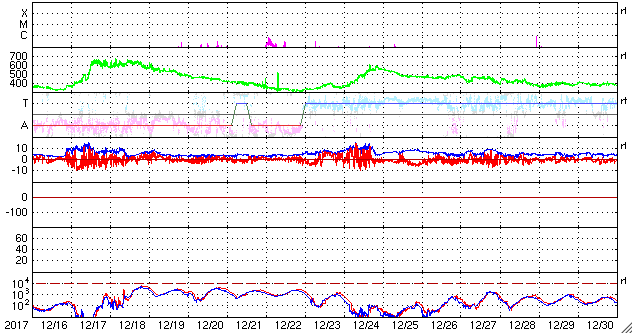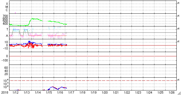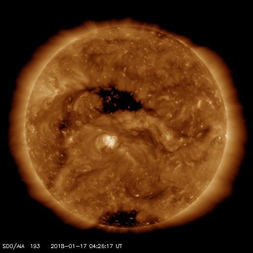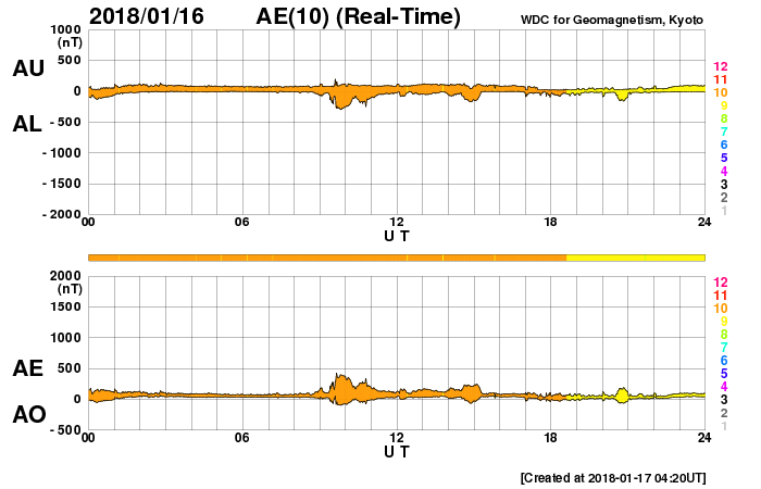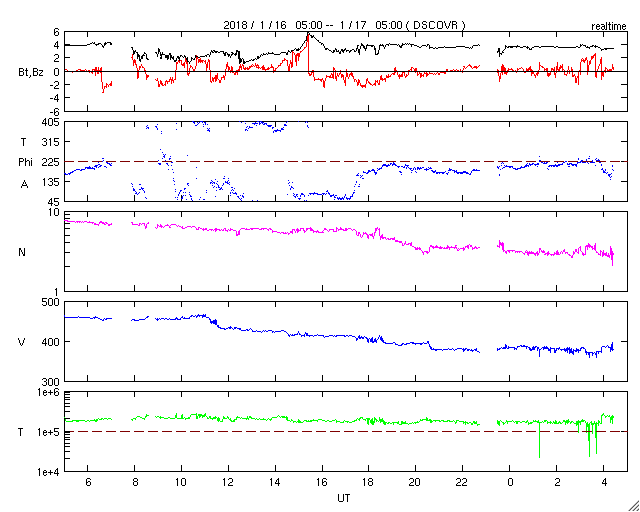 2018/ 1/17 13:39 更新 太陽風はやや低速になり、磁気圏は穏やかです。 担当 篠原 太陽風の速度は380km/秒に下がり、 やや低速になっています。 磁場強度は、3〜4nTと少し弱い状態です。 太陽風の高まりは通り過ぎています。 太陽風磁場の南北成分は、 0nT付近で小さく変化しています。 速度が下がったこともあり、磁気圏は穏やかで、 AE指数は時々小さい変化が見られる程度です。 今日はSDO衛星のサイトが回復して、 AIA193の最新画像を掲載しています。 北半球の中央部にコロナホールが広がっていて、 2〜3日後くらいから影響が始まりそうです。 太陽の可視光写真では、 中央部に2696黒点群が見えています。 X線グラフは変化なく、太陽は穏やかです。