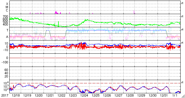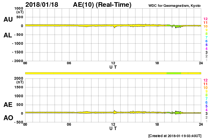 下段のAEグラフの値が高くなると、オーロラ活動が活発化しています。