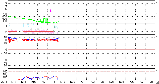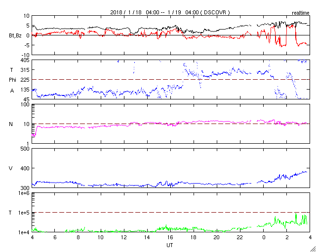 2018/ 1/18 13:35 太陽風は更に低速になっています。明日以降、コロナホールの影響が始まりそうです。