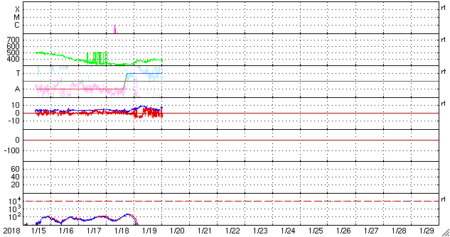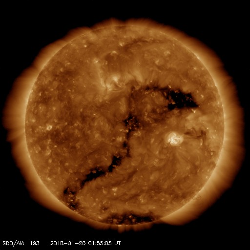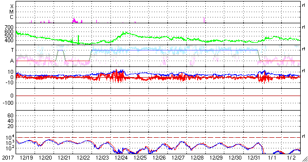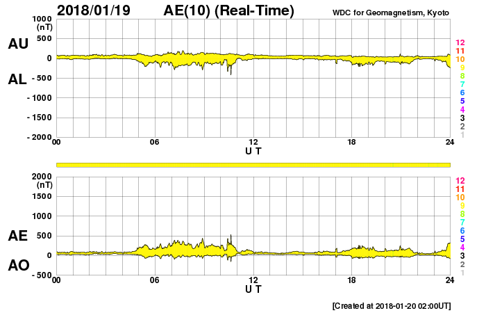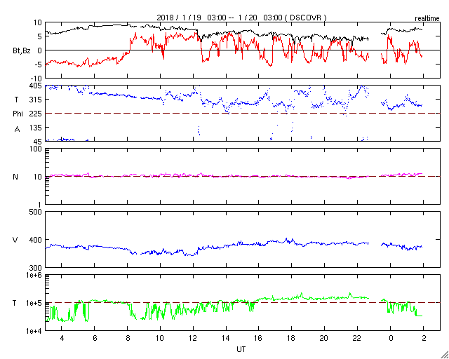 2018/ 1/20 11:03 更新 太陽風は平均的な状態です。これからコロナホールの影響が始まるかもしれません。 担当 篠原 太陽風は、磁場強度は5〜8nTと少し強まっていますが、 速度は380km/秒で安定しています。 コロナホールの影響はまだ到来していないようです。 27日周期の図を見ると、 前周期の太陽風の高まりはこれから始まっています。 今回も同じようなタイミングになるのでしょうか。 太陽風磁場の南北成分は、 南北に切り替わりながら変化しています。 磁気圏もある程度活動的になっていて、 AE指数は、200〜400nTと小規模ですが、 変化が良く起きています。 これから太陽風の強まりが到来した時に、 南北成分がこれまでと同様に変化すると、 オーロラの活動は更に強まるでしょう。 この後の太陽風の変化や 極域のライブカメラに注目してください。 太陽は、黒点は見えなくなっています。 活動はなく、穏やかです。 学内工事の状況が変わって、 臨時サーバーへの避難は、 今夜から明日の午後にかけてになりそうです。 比較的短時間で元に戻れると思います。 ![]() SDO衛星のAIA193カメラによる太陽コロナの様子 (c) SDO (NASA) ![]() SDO衛星による太陽の可視光写真 (c) SDO (NASA) ![]() DSCOVRが観測した太陽風の磁場(1番上の枠、黒線は全体の強度、赤線は南北成分) および、太陽風の密度(3番目の紫線)、速度(4番目の青線) (c) データ:NOAA/SWPC、作図:宇宙天気ニュース ![]() AE指数(速報値) 下段のAEグラフの値が高くなると、オーロラ活動が活発化しています。 (c) 京都大学WDC ![]() ![]() 27日の太陽周期に合わせたデータプロット 太陽が同じ面を地球に向けていた27日前の変化から、今後を予想することができます。 (c) 作図:宇宙天気ニュース