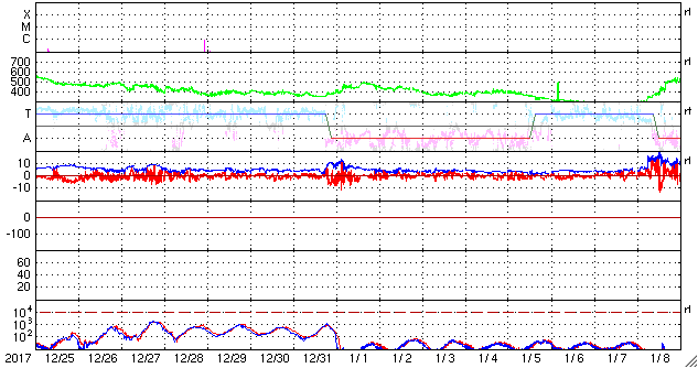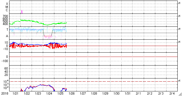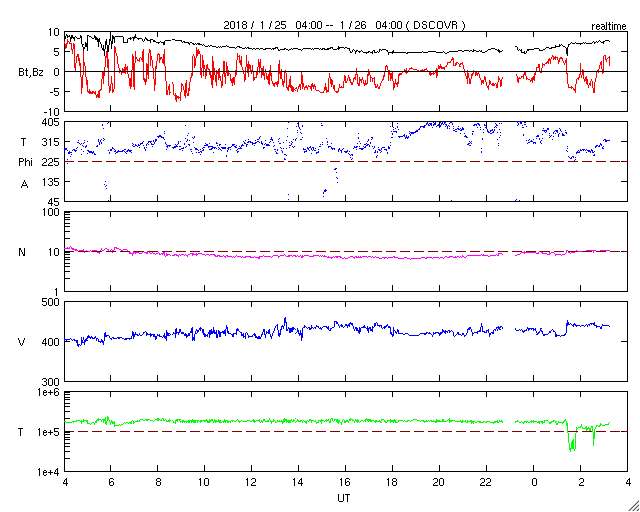 2018/ 1/25 13:31 太陽風磁場の強まりが到来し、磁気圏の活動をやや高めています。