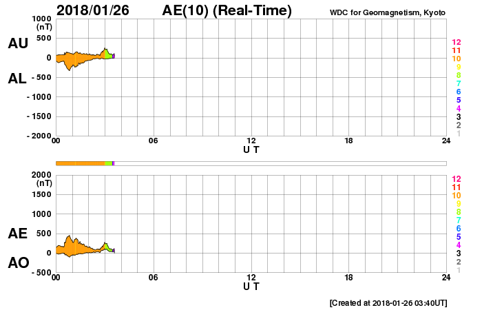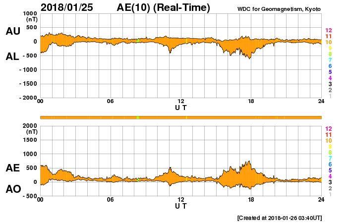 下段のAEグラフの値が高くなると、オーロラ活動が活発化しています。