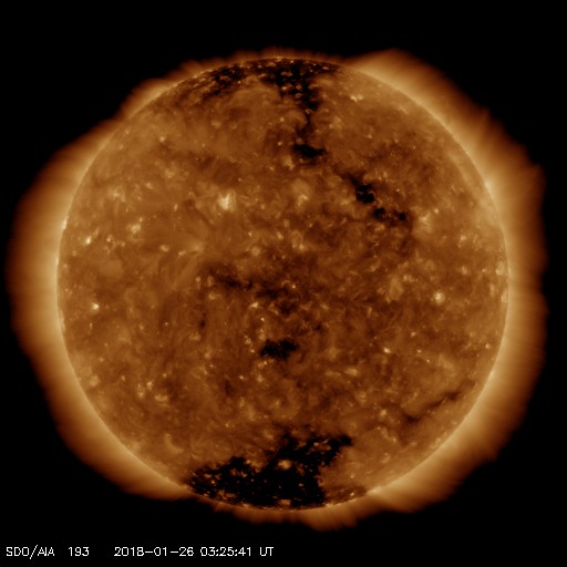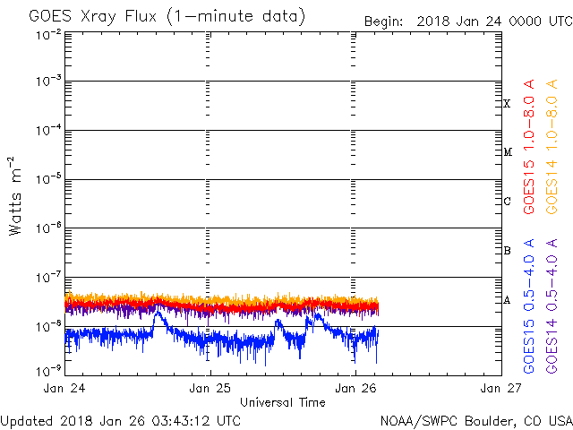 2018/ 1/22 12:31 高速太陽風が到来しました。B9.5の小さいフレアが発生しています。
