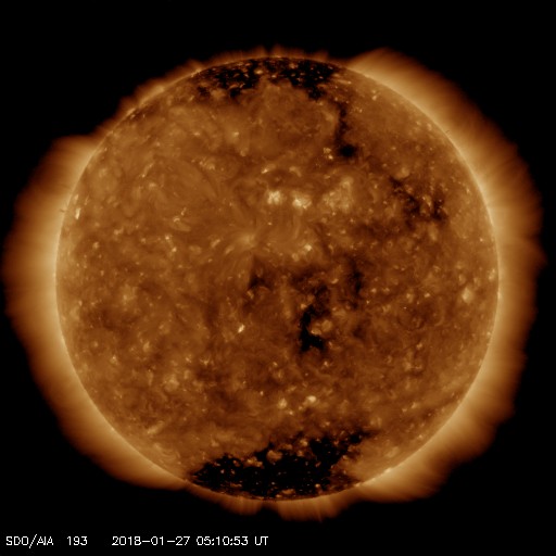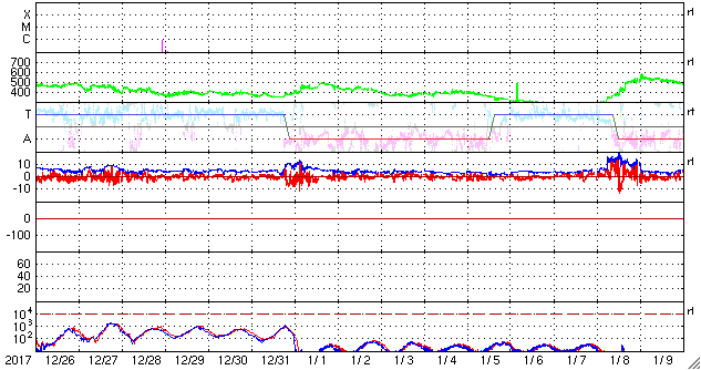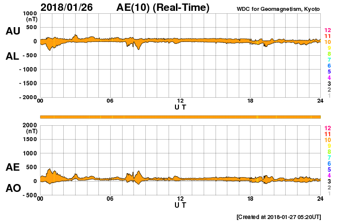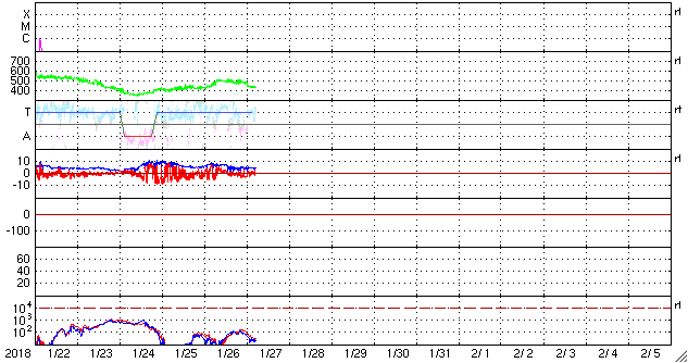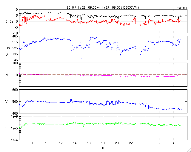 2018/ 1/27 14:30 更新 太陽風の弱い高まりは通り過ぎ、磁気圏は穏やかになっています。 担当 篠原 太陽風の速度は、昨日の午後、 26日16時(世界時26日7時)に、500km/秒に上がりました。 その後はゆっくりと下がり続け、 今朝くらいに450km/秒を割り、 現在は430km/秒と平均的な速さに戻っています。 磁場強度も、7nTから5nTヘ下がり、 こちらも平均的な値です。 27日周期の図では、 今回の変化は、1日程度の小さい高まりとして見えています。 太陽風磁場の南北成分は、振れ幅は小さくなり、 0nT近くに留まっています。 このため、磁気圏の活動は穏やかになっていて、 AE指数の変化はなくなっています。 現在は速度も下がってきたため、 磁気圏は穏やかに推移しそうです。 SDO衛星AIA193の太陽コロナ写真では、 中央部の右寄りに淡いコロナホールの広がりが見えます。 この領域は、27日前にはほとんど見えていませんでした。 影響がやって来るかどうか、この点にも注目してください。 太陽は無黒点で、X線グラフも変化なく、 穏やかに推移しています。