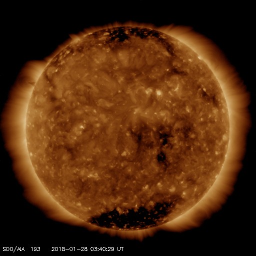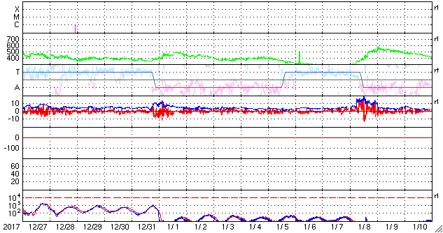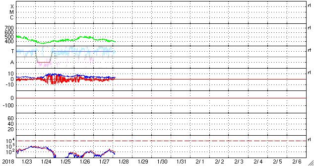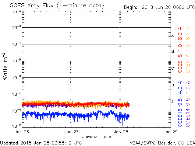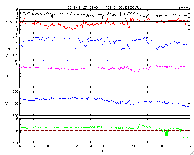 2018/ 1/28 12:59 更新 太陽風は平均的な速度で、磁気圏も概ね静穏です。 担当 篠原 太陽風の速度は、 今日に入る頃に、430km/秒から400km/秒へ少し下がり、 更に、現在は380km/秒と400km/秒台を割りかけています。 磁場強度も、4nTから3nTへ少し下がる変化をしていて、 太陽風は穏やかに推移しています。 太陽風磁場の南北成分は、振れ幅は小さいのですが、 グラフの前半で南寄りに推移したため、 AE指数にも500nT近い高まりが発生しています。 その後は、南北成分は0nT付近に弱まり、 AE指数も変化しなくなっています。 27日周期の図を見ると、 前周期の1月1日に弱い太陽風の高まりが到来しています。 この後、この変化の回帰が見られるか。 あるいは、SDO衛星AIA193のコロナ写真の 太陽中央部にある淡いコロナホールの影響が到来するか。 変化が始まったとき、原因を見分けるのは難しいですが、 今後の推移に注目してください。 太陽は、今日も無黒点です。 X線グラフも変化はなく、太陽はとても穏やかです。
