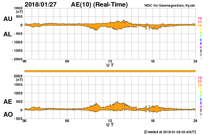 (c) SDO (NASA) ![]() SDO衛星による太陽の可視光写真 (c) SDO (NASA) ![]() DSCOVRが観測した太陽風の磁場(1番上の枠、黒線は全体の強度、赤線は南北成分) および、太陽風の密度(3番目の紫線)、速度(4番目の青線) (c) データ:NOAA/SWPC、作図:宇宙天気ニュース ![]() AE指数(速報値) 下段のAEグラフの値が高くなると、オーロラ活動が活発化しています。 (c) 京都大学WDC ![]() ![]() 27日の太陽周期に合わせたデータプロット 太陽が同じ面を地球に向けていた27日前の変化から、今後を予想することができます。 (c) 作図:宇宙天気ニュース