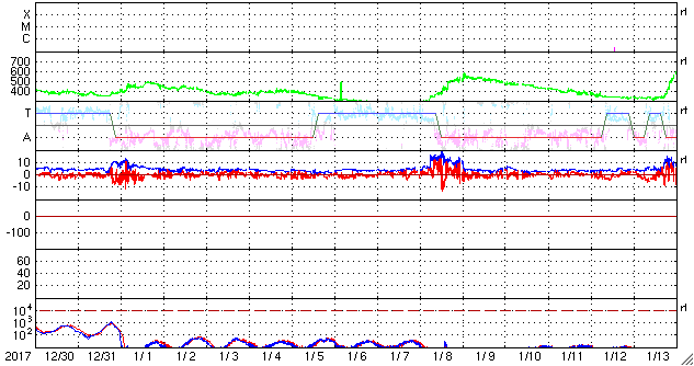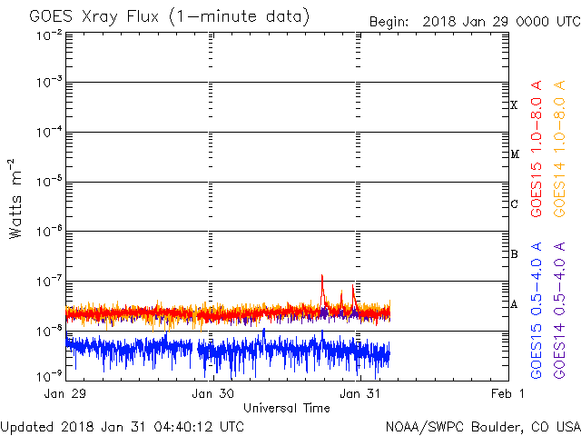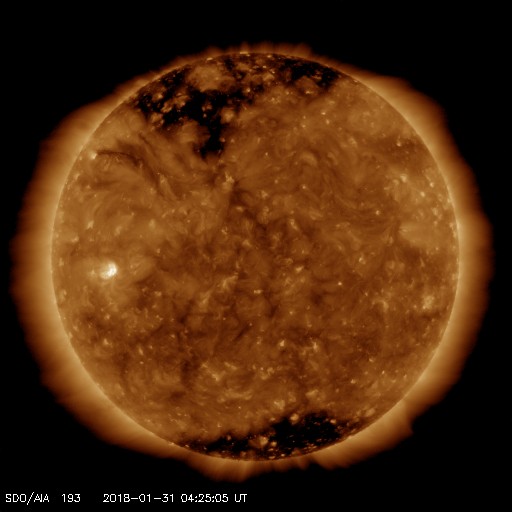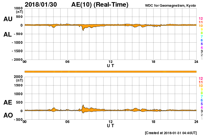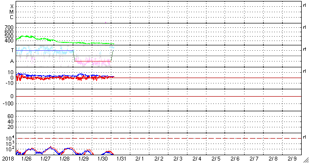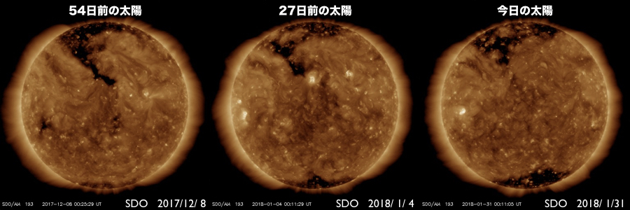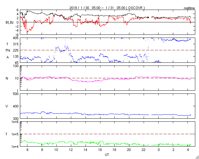 2018/ 1/31 13:40 更新 太陽の東側に小さい黒点が現れています。太陽風は更に低速になっています。 担当 篠原 昨日の夜くらいから、太陽の東側(左側)に活動的な領域が現れ、 黒点も発生して、2697黒点群と番号が付けられています。 ただし、黒点はかなり小さいため、 掲載の可視光写真では見つけることができません。 SDO衛星AIA193のコロナ写真の明るく光っている場所です。 これに伴って、X線グラフにも小さい変化が発生しています。 今後、この領域はどの様に変化するでしょうか。 太陽風は、速度が320km/秒に下がり、 更に低速の風になっています。 磁場強度も、2nT程度に弱まっています。 磁気圏も静穏で、AE指数はほとんど変化がありません。 SDO衛星AIA193の太陽コロナ写真では、 北極域からコロナホールが低緯度側に伸びています。 この領域は、前周期(27日前)や2周期前(54日前)は、 今回よりも低緯度側に伸びていて(1枚目の写真を参照)、 27日周期の図を見ると、 前周期は1月8日に太陽風速度の高まりをもたらしていました。 今回、27日後に変化が回帰すると考えると、 2月4日頃になります。 一方、コロナホールがやや小さくなっていることから、 前回ほどの変化は見られないかもしれません。 今後の太陽風の注目点です。 今夜の皆既月食ですが、 鹿児島は、朝まではとても良い天気だったのですが、 次第に高層に雲が現れて、既に薄曇りの状態です。 天気予報は、相変わらず夜から「みぞれ」となっています。 せめて、雲の隙間から月が見えないかと期待しているのですが、 かなり厳しそうです。