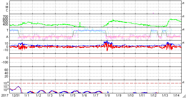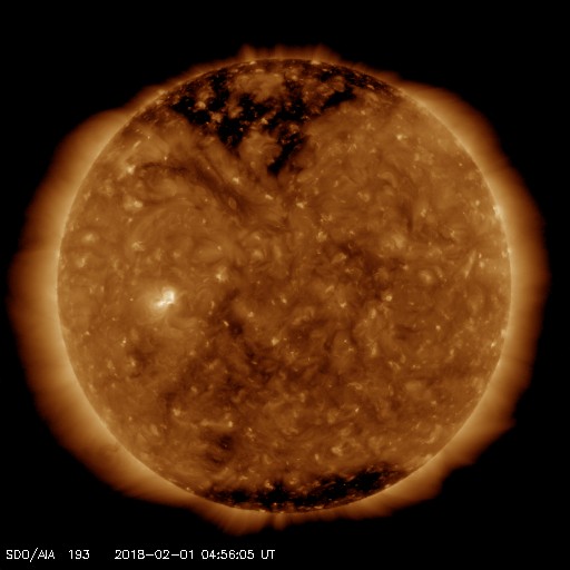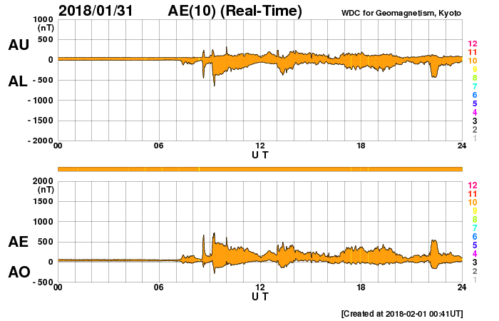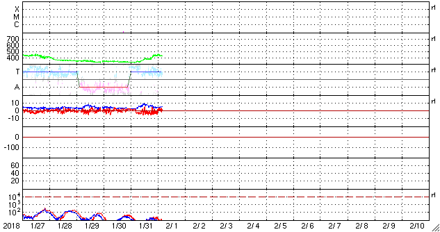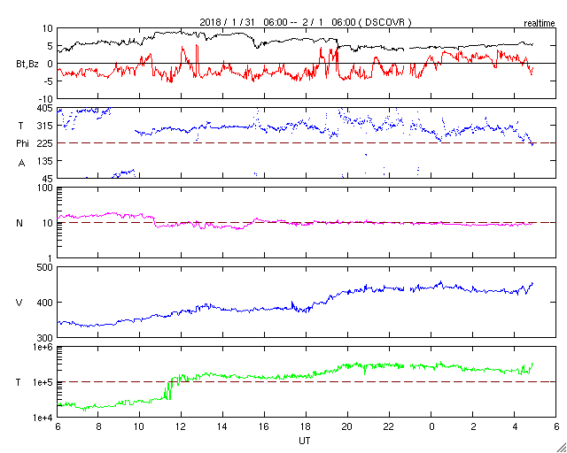 2018/ 2/ 1 14:06 更新 太陽風は平均的な速度に戻っています。太陽は無黒点になっています。 担当 篠原 太陽風は、昨日の午後からやや高まって、 磁場強度は3nTから8nTへ強まり、 速度も330km/秒から、430km/秒へ高まりました。 一方、磁場強度は現在は5nTに戻っています。 どちらも平均的な値に高まった程度の変化で、 全体としては穏やかに推移しています。 太陽風磁場の南北成分は、 昨日から今朝にかけて弱い南寄りの傾向が続きました。 速度が平均的な値に戻りかけていたこともあり、 磁気圏の活動はやや高まって、 AE指数では、300〜500nTの小規模の活動が 連続的に発生しました。 その後は磁場は北寄りになり、 AE指数の変化は小さくなっています。 SDO衛星AIA193の太陽コロナ写真では、 太陽の中央部には目立ったコロナホールはなく、 太陽風は基本的には穏やかに推移しそうです。 北半球の高緯度域にコロナホールが広がっていますが、 昨日紹介した様に、 この領域の影響は今回はどの程度になるでしょうか。 4日頃からの太陽風に注目して下さい。 太陽は、2697黒点群は見えなくなり、 無黒点になっています。 X線グラフも変化はなく、穏やかです。