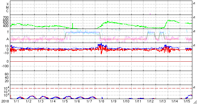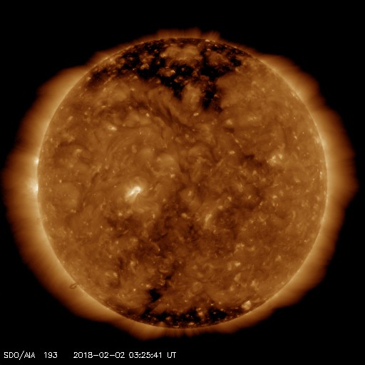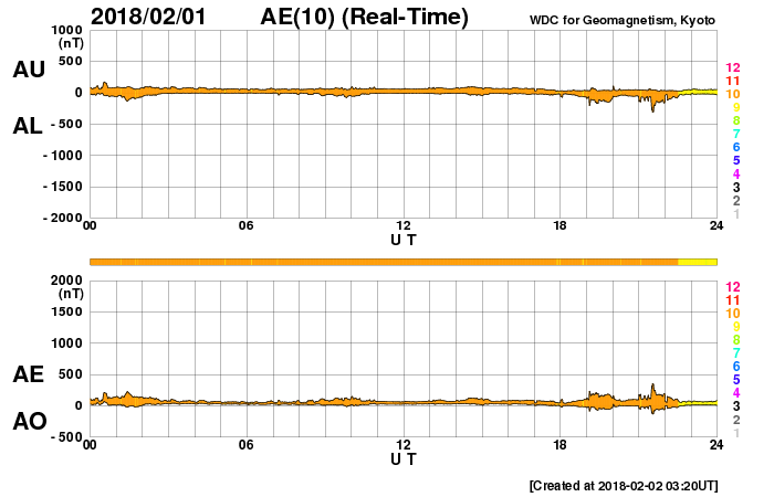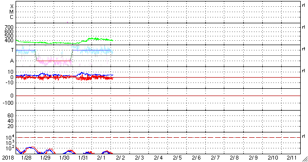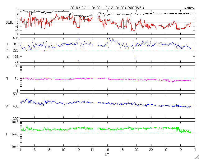 2018/ 2/ 2 12:31 更新 太陽風は平均的な状態ですが、速度は次第に下がっています。 担当 篠原 太陽風の速度は、430km/秒から390km/秒へ ゆっくり下がっています。 磁場強度も、5nTから4nTへわずかですが低下の傾向です。 太陽風は、全体としては穏やかに推移しています。 太陽風磁場の南北成分は、 掲載のグラフでは、北寄りから南寄りに傾向が変化しています。 ただし、振れ幅は小さく、速度も高まってはいないため、 磁気圏は穏やかです。 AE指数のグラフでは、後半に小さい変化が見えている程度です。 SDO衛星AIA193の太陽コロナ写真では、 北極域のコロナホールが西に少し進んでいます。 この領域の影響の到来は、もう少し先です。 太陽の低緯度域には東半球にかけてコロナホールはなく、 太陽風はしばらく穏やかに推移しそうです。 太陽は、黒点は見られず、 X線グラフも特に変化はありません。 静かに推移しています。