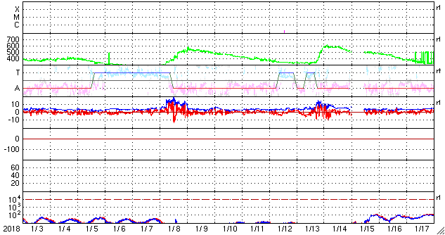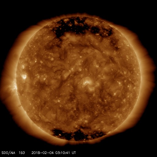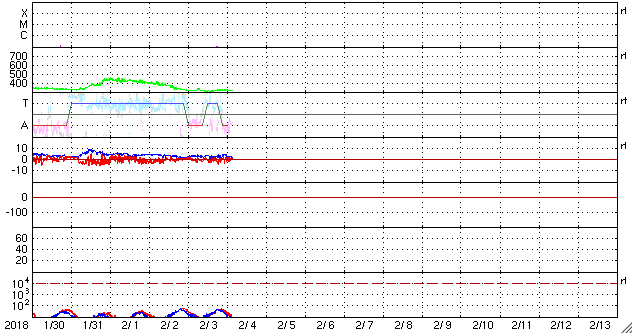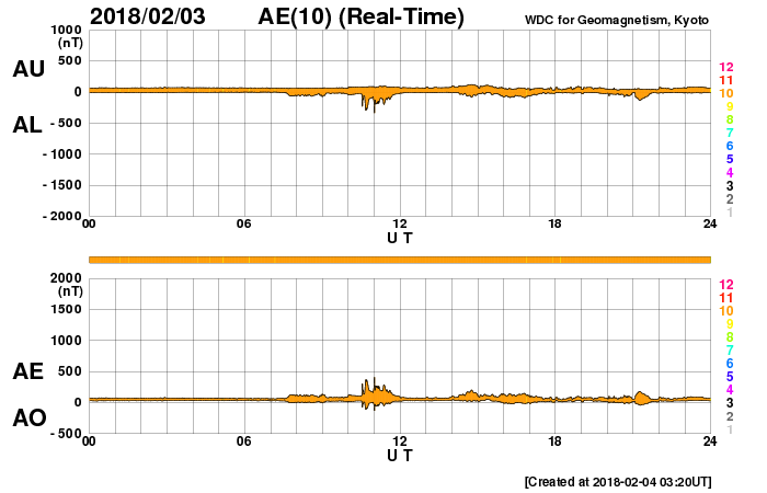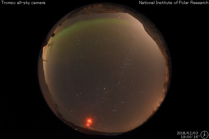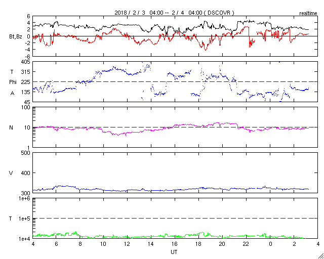 2018/ 2/ 4 12:30 更新 太陽風は低速です。太陽は無黒点が続いています。 担当 篠原 太陽風は、320km/秒と低速の状態で安定しています。 磁場強度も、2〜4nTと弱い値を推移しています。 27日周期の図を見ると、 前周期の太陽風は、この後に速度の高まりが発生していますが、 今回はどうなるでしょうか。 磁気圏も穏やかで、 AE指数のグラフはほとんど変化がありません。 それでも、全く何もないということではなく、 ノルウェーのトロムソでは、世界時3日19時過ぎに、 オーロラのにぎやかな輝きが見られています。 SDO衛星AIA193では、低緯度域にコロナホールはなく、 しばらくの間、太陽風は穏やかな風が続きそうです。 太陽は、今日も無黒点です。 ただし、東端(左端)から活動的な領域が近づいている様で、 X線グラフに小さい変化が起こる様になっています。 SDO衛星AIA193でも、明るい領域が小さく見えています。 黒点の登場となるでしょうか。 ![]() ノルウェーのトロムソで全天カメラにより撮影された、世界時3日19〜20時半のオーロラ。 (c) 国立極地研究所、(動画加工 : 宇宙天気ニュース) ![]() SDO衛星のAIA193カメラによる太陽コロナの様子 (c) SDO (NASA) ![]() SDO衛星による太陽の可視光写真 (c) SDO (NASA) ![]() DSCOVRが観測した太陽風の磁場(1番上の枠、黒線は全体の強度、赤線は南北成分) および、太陽風の密度(3番目の紫線)、速度(4番目の青線) (c) データ:NOAA/SWPC、作図:宇宙天気ニュース ![]() AE指数(速報値) 下段のAEグラフの値が高くなると、オーロラ活動が活発化しています。 (c) 京都大学WDC ![]() ![]() 27日の太陽周期に合わせたデータプロット 太陽が同じ面を地球に向けていた27日前の変化から、今後を予想することができます。 (c) 作図:宇宙天気ニュース