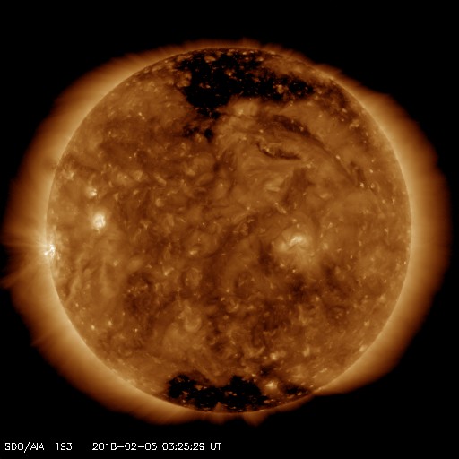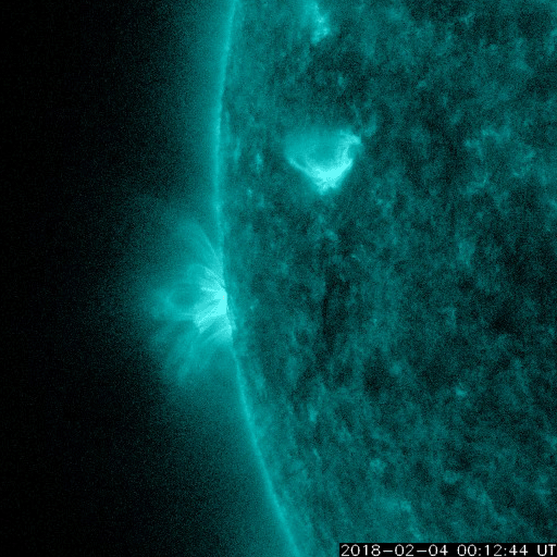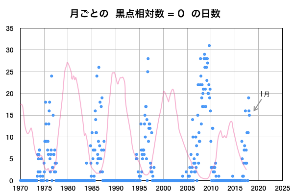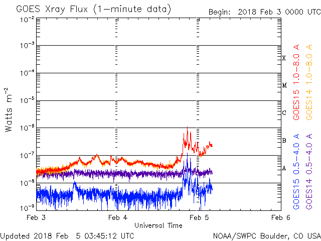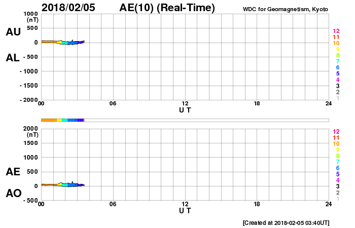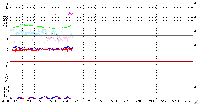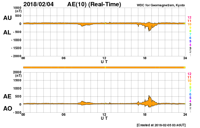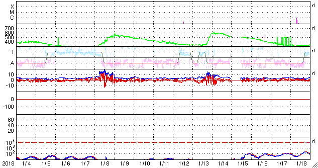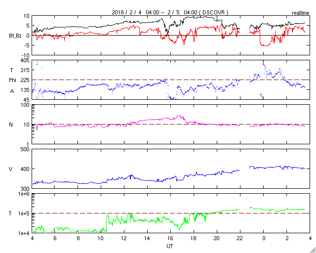 2018/ 2/ 5 12:45 更新 3か月半ぶりにCクラスに達するフレアが発生しました。1月の黒点相対数は 6.7 でした。 担当 篠原 WDC-SILSOより1月の太陽黒点相対数が発表され、 月平均値は 6.7 と3か月連続の1桁台となりました。 11月は5.7、12月は8.2です。 黒点が見えなかった黒点相対数 = 0 の日も、 15日と1か月のほぼ半分です。 こちらも、11月は19日、12月は16日と 半数前後の月が3か月続いていて、 太陽活動の弱まりは、このレベルに達していると言えそうです。 どちらの値も、前の周期の極小の始まりと比べると、 2007年後半頃に相当します。 前回は、その後更に無黒点の日が増えて、 20日台後半に達しました。 今回はどこまで増えるでしょうか。 今日の太陽は、東端から黒点が出現しています。 昨日、活動的な領域が近づいていると書いていた場所で、 2699黒点群と番号が付いています。 X線グラフも細かい活動が頻発する様になり、 今朝、5日5時半(世界時4日20時半)に、 C1.1の小規模フレアも発生しています。 Cクラスに達するフレアの発生は、 昨年10月20日のM1.1以来で、3か月半ぶりのことです。 B9と、Cまであと少しというフレアは起きていましたが、 Cのラインを超えたのはずいぶん久しぶりです。 SDO衛星AIA131による動画を掲載します。 細かい活動が活発に起きている様子が分かります。 今後の2699群の変化に注目してください。 太陽風は、昨夜から今日未明にかけて磁場が強まり、 10nT近くまで高まりました。 それとともに速度もやや上昇して、 330km/秒の低速風から、 現在は400km/秒と平均的な速度に変化しています。 一方、速度が上がると磁場強度は下がり、 5nTと平均的な値に戻っています。 27日周期の図の前周期、1月8日に見られた変化が、 弱くなって回帰したのかもしれません。 速度の高まりはこの程度で終わるのか、 もうしばらく注目してください。 太陽風の磁場強度は強まりましたが、 南北成分はあまり南向きに振れず、 磁気圏の活動は、一時的にAE指数500nTの変化が起きた程度です。