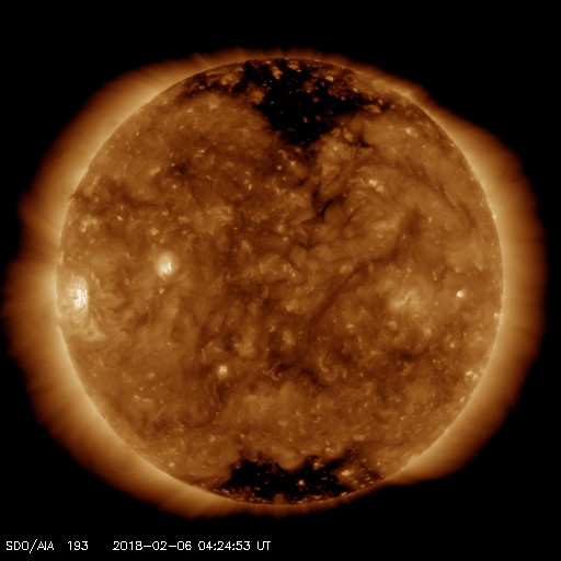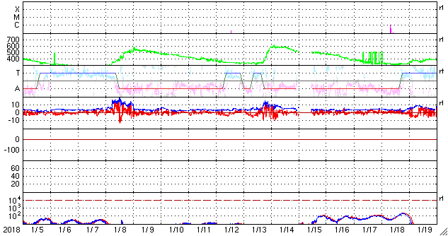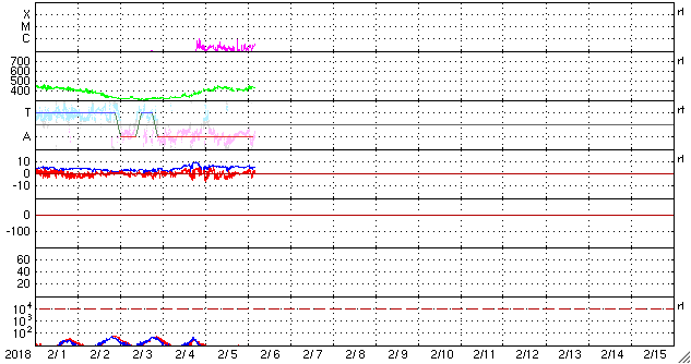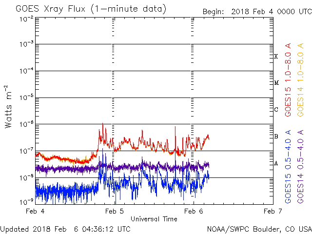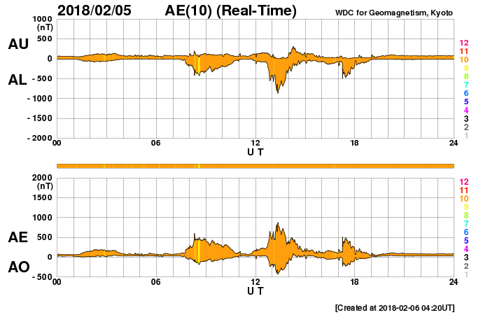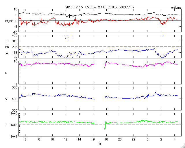 2018/ 2/ 6 13:37 更新 2699黒点群は少し大きくなっています。太陽風は平均的な状態です。 担当 篠原 太陽の東の2699黒点群は、 黒点が少し大きくなっています。 東端に現れてからの様子を、 SDO衛星可視光カメラの動画で紹介します。 X線グラフも細かく変化していますが、 B8の変化が最大で、Cクラスに届くフレアは発生していません。 昨日に続いて、C以上のフレアは起きるでしょうか。 太陽風は、速度430km/秒、磁場強度6nTと、 平均的な状態で安定しています。 磁場の南北成分は、 グラフの前半は南寄り、後半はやや北寄りに変わっています。 AE指数では、南寄りの頃に 500〜800nTの中規模の変化が発生しています。 その後は変化がなくなり、磁気圏は穏やかになっています。 SDO衛星AIA193では、 太陽の中心部にはコロナホールは見られません。 太陽風は、次第に速度が下がり、 穏やかな風がしばらく続きそうです。