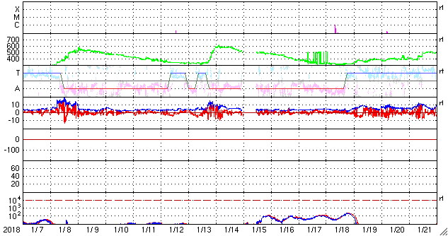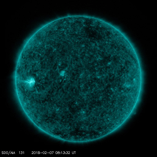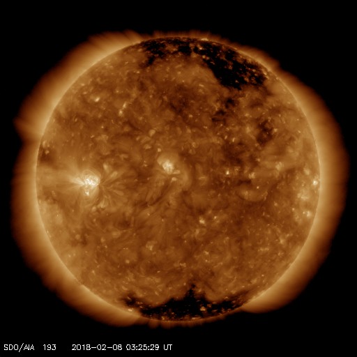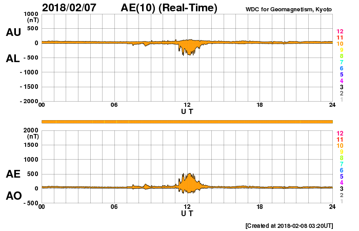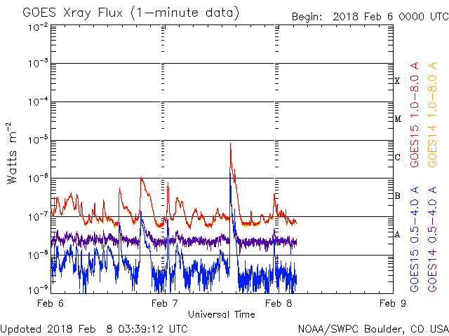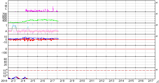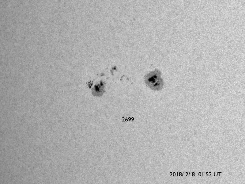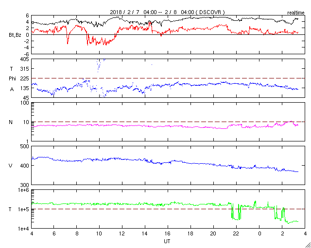 2018/ 2/ 8 12:39 更新 2699黒点群で、C8.1の小規模フレアが発生しました。 担当 篠原 2699黒点群が更に大きなフレアを起こしています。 昨夜、22時半(世界時7日13時半)のC8.1小規模フレアです。 3日前の記事でも紹介しましたが、 こちらこそ、昨年10月20日のM1.1以来、 3か月半ぶりの活動と言える規模のフレアです。 フレアの様子を、SDO衛星AIA131の動画で紹介します。 久しぶりの大きさなので話題性はありますが、 こうして動画に加工すると、 Cクラス相応の変化ではあるなという印象です。 可視光写真では、 2699群の黒点は、昨日と同程度の広がりを保っています。 更なるフレアを起こすかどうか、引き続き注目してください。 太陽風は、ゆっくりと速度が下がり始め、 現在は370km/秒とやや低速の状態になっています。 磁場強度は、4〜5nTと平均的な値で安定しています。 27日周期の図の前周期同様に、更に低速の風になりそうです。 ただし、前周期は、1月13日以降、高速の太陽風が到来しています。 この高速風をもたらしたコロナホールが、 現在の太陽では見えなくなっていて、 この高まりの回帰が見られるかどうか、 明後日以降の太陽風に注目してください。 太陽風磁場の南北成分は、北寄りの傾向になっています。 このため、磁気圏は穏やかな状態が続いています。 AE指数では、500nTの変化が1回起きていますが、 太陽風のデータを見ると、 この頃だけ、一時的に磁場が南を向いていたようです。 太陽風の速度が下がりつつあることもあり、 磁気圏は穏やかに推移しそうです。 ![]() 2699黒点群で発生したC8.1の小規模フレア。SDO衛星AIA131。 (c) SDO (NASA)、(動画加工 : 宇宙天気ニュース) ![]() 2699黒点群の拡大写真。SDO衛星。 (c) SDO (NASA)、作図:宇宙天気ニュース ![]() SDO衛星のAIA193カメラによる太陽コロナの様子 (c) SDO (NASA) ![]() SDO衛星による太陽の可視光写真。マウスの矢印を写真に重ねると、黒点番号付きの写真に切り替わります。 (c) SDO (NASA) ![]() GOES衛星の太陽X線データ (c) NOAA/SWPC ![]() DSCOVRが観測した太陽風の磁場(1番上の枠、黒線は全体の強度、赤線は南北成分) および、太陽風の密度(3番目の紫線)、速度(4番目の青線) (c) データ:NOAA/SWPC、作図:宇宙天気ニュース ![]() AE指数(速報値) 下段のAEグラフの値が高くなると、オーロラ活動が活発化しています。 (c) 京都大学WDC ![]() ![]() 27日の太陽周期に合わせたデータプロット 太陽が同じ面を地球に向けていた27日前の変化から、今後を予想することができます。 (c) 作図:宇宙天気ニュース