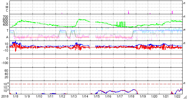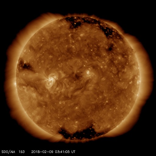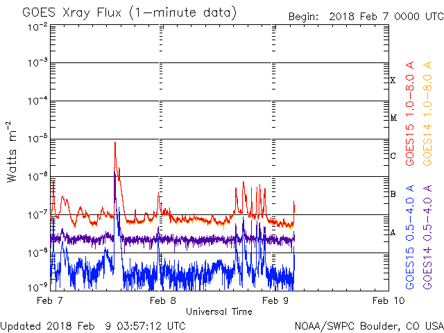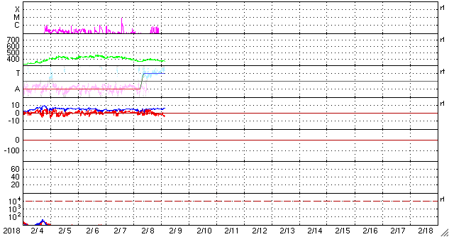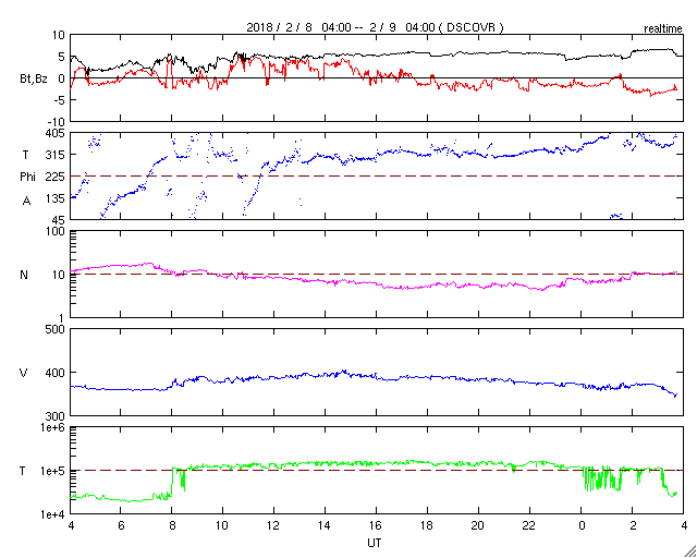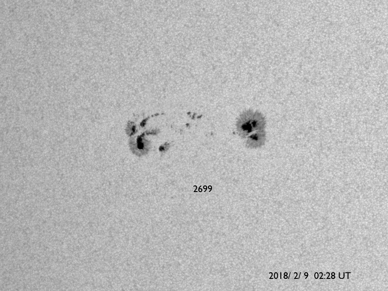 2018/ 2/ 9 12:58 更新 2699黒点群では小さい活動が続いています。 担当 篠原 2699黒点群は、 変化の規模は小さいですが、活動的な状態が続いています。 C8.1フレアの後、しばらく静かになっていましたが、 今日に入った頃から(世界時では8日の後半から)、 X線グラフにBクラスの小さい変化が連続的に発生しています。 SDO衛星AIA131による動画を掲載します。 また、可視光写真を見ると、 黒点の広がりも規模を保っている様です。 2699群は、再びCクラスに達する活動を起こすでしょうか。 引き続き注目してください。 太陽風は、速度が350km/秒から380km/秒へ 少し上がる変化がみられましたが、 現在は再び350klm/秒へ下がり、低速の状態が続いています。 磁気圏は穏やかで、AE指数はほとんど変化が起きていません。 SDO衛星AIA193の太陽コロナ写真では、 太陽の中心部にコロナホールはみられず、 穏やかな太陽風がしばらく続きそうです。 ![]() 2699黒点群の活動の様子。SDO衛星AIA131。 (c) SDO (NASA)、(動画加工 : 宇宙天気ニュース) ![]() 2699黒点群の拡大写真。SDO衛星。 (c) SDO (NASA)、作図:宇宙天気ニュース ![]() SDO衛星のAIA193カメラによる太陽コロナの様子 (c) SDO (NASA) ![]() SDO衛星による太陽の可視光写真。マウスの矢印を写真に重ねると、黒点番号付きの写真に切り替わります。 (c) SDO (NASA) ![]() GOES衛星の太陽X線データ (c) NOAA/SWPC ![]() DSCOVRが観測した太陽風の磁場(1番上の枠、黒線は全体の強度、赤線は南北成分) および、太陽風の密度(3番目の紫線)、速度(4番目の青線) (c) データ:NOAA/SWPC、作図:宇宙天気ニュース ![]() AE指数(速報値) 下段のAEグラフの値が高くなると、オーロラ活動が活発化しています。 (c) 京都大学WDC ![]() ![]() 27日の太陽周期に合わせたデータプロット 太陽が同じ面を地球に向けていた27日前の変化から、今後を予想することができます。 (c) 作図:宇宙天気ニュース