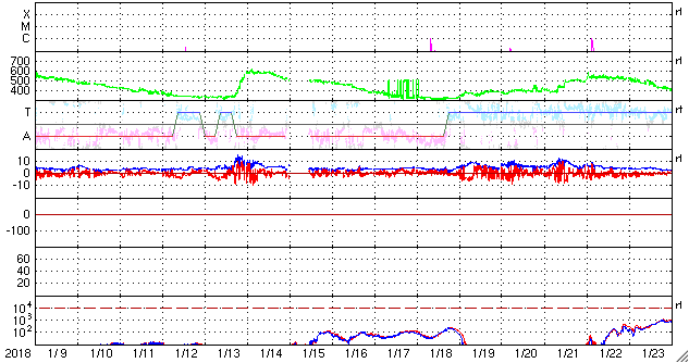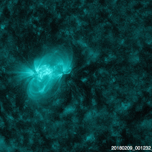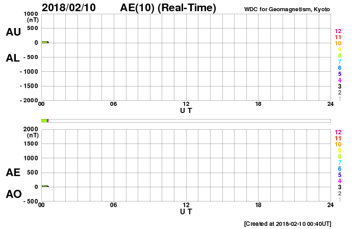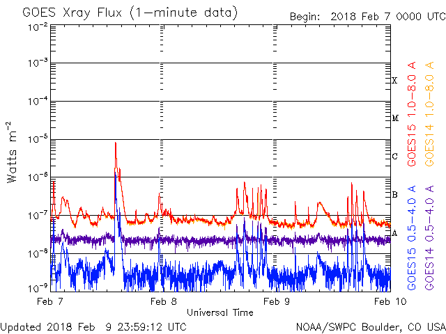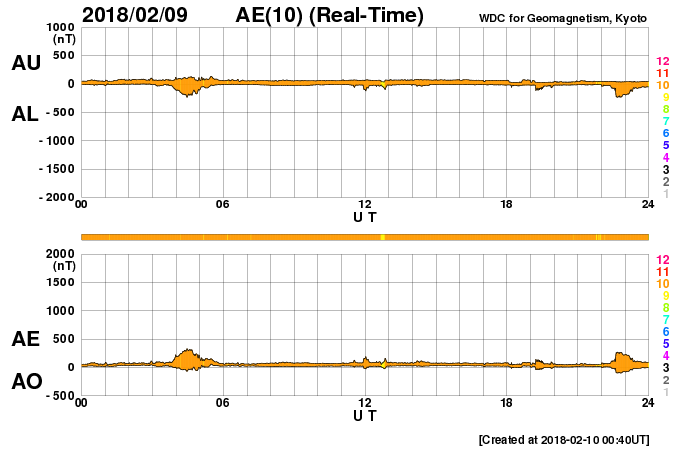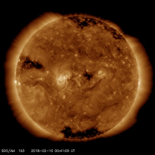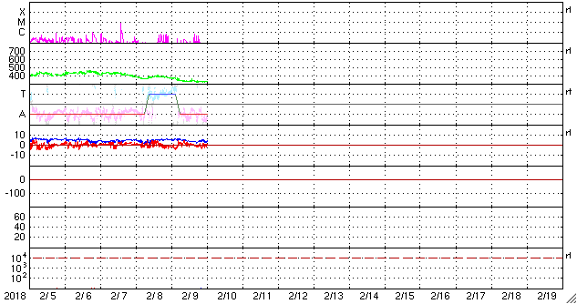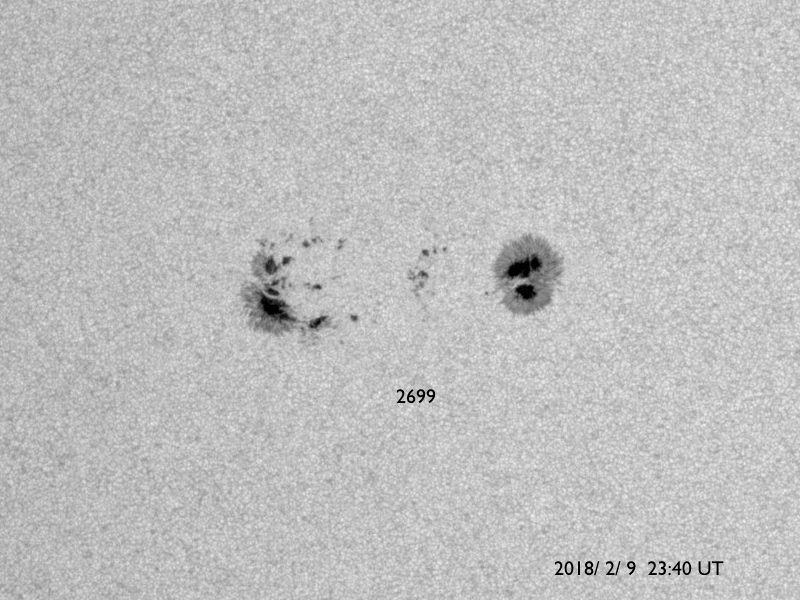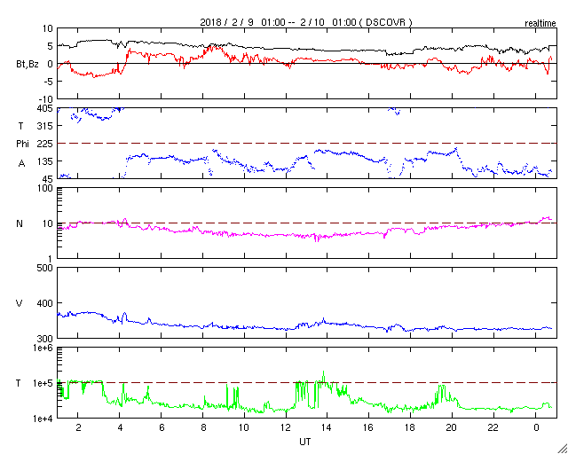 2018/ 2/10 09:55 更新 2699黒点群でBクラスのフレアが続いています。太陽風は低速です。 担当 篠原 2699黒点群は、太陽の中心部に近付いています。 Bクラスの小さい活動は続いていて、 X線グラフは細かい変化が頻繁に発生しています。 活動の様子を、SDO衛星AIA131の動画で紹介します。 一方、黒点の見え方としては、昨日から大きな違いはなく、 この辺りで落ち着きそうな様子もあります。 SDO衛星AIA193のコロナ写真では、 東端(左端)に強く光る場所が新しく見え始めています。 新しい黒点が現れるでしょうか。 太陽風は、速度が330km/秒へ下がり、 低速の穏やかな風になっています。 磁場強度も、3〜4nTとやや弱くなっています。 磁気圏も静穏で、AE指数は目立った変化は起きていません。 27日周期の図を見ると、 前周期の今頃(1月13〜14日)は、 太陽風速度の高まりが到来していますが、 今回は今のところ穏やかに推移しています。 このまま低速の風が続いた場合、 次の大きな変化は、 SDO衛星AIA193の太陽の東端(左端)付近に見えている、 コロナホールの影響になりそうです。