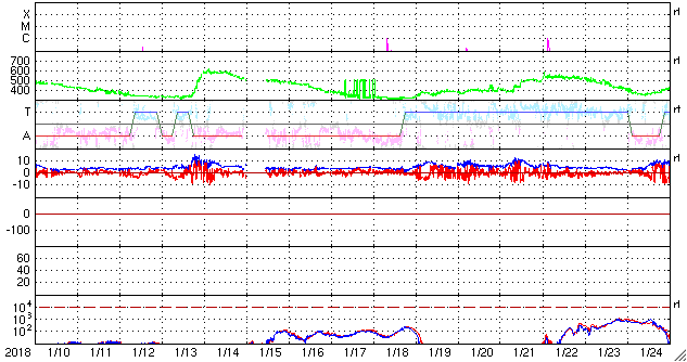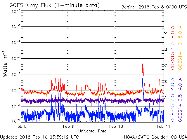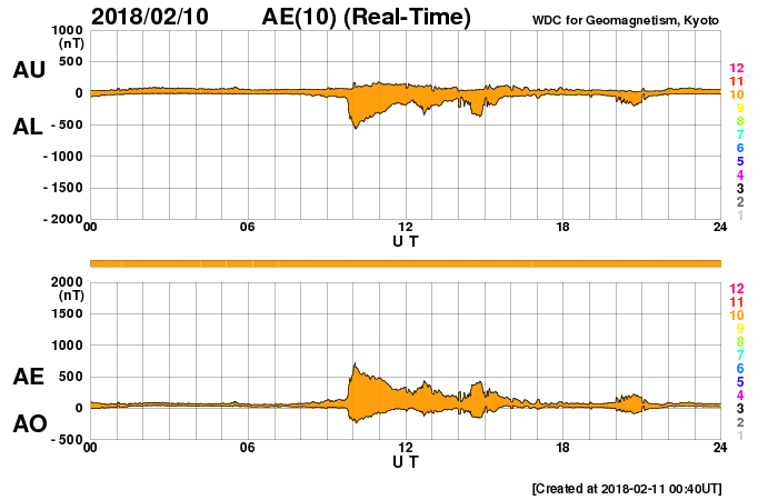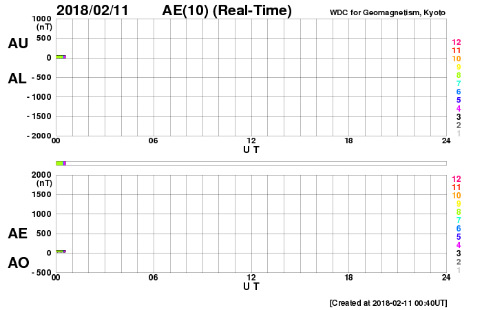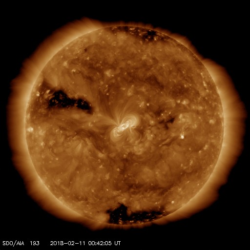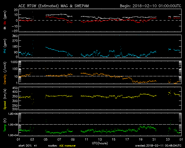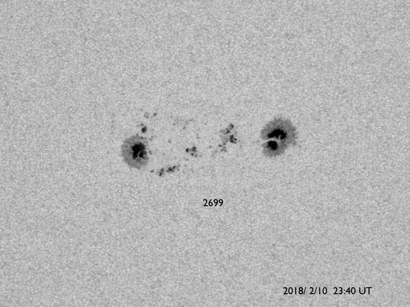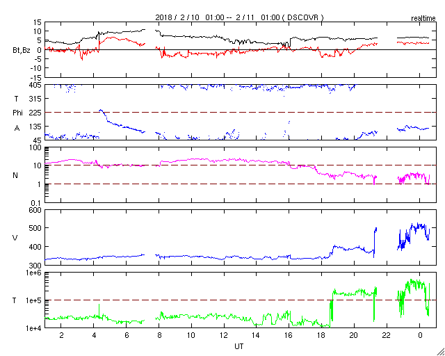 2018/ 2/11 09:48 更新 2699黒点群で、C4.6の小規模フレアが発生しました。 担当 篠原 昨夜、10日22時(世界時10日13時)に、 2699黒点群でC4.6の小規模フレアが発生しました。 2699群のCフレアは5回目です。 フレアの様子を、SDO衛星AIA131の動画で紹介します。 C4フレアの後も、小さい活動が続いています。 引き続き注目してください。 また、太陽の東端には黒点は現れず、 可視光写真では、太陽の中央に2699群が見えるだけです。 太陽風は、DSCOVR衛星のデータでは、 速度が500km/秒に上昇していますが、 ACE衛星のグラフは、 370km/秒に少し上がっていますが、低速のままです。 磁場強度を見ると、どちらも6nTと平均的な値で安定しています。 速度が上昇する様子でもないので、 ACE衛星のグラフの方が正しいのではないかと思います。 磁気圏の活動は、 昨日の夕方頃に太陽風磁場が南向きに変化した影響で、 AE指数700nTの中規模の活動が発生していますが、 以降は穏やかです。 現在の磁場は北向きに振れているので、 速度が高まっていたとしても、磁気圏は穏やかでしょう。 SDO衛星AIA193の太陽コロナ写真では、 太陽の東側から、コロナホールが横に伸びて来ました。 もう2日ほどで太陽の中心線に達して、 5日後くらいから太陽風の変化が始まりそうです。