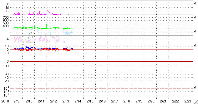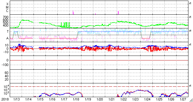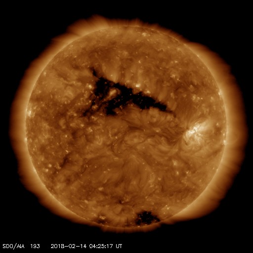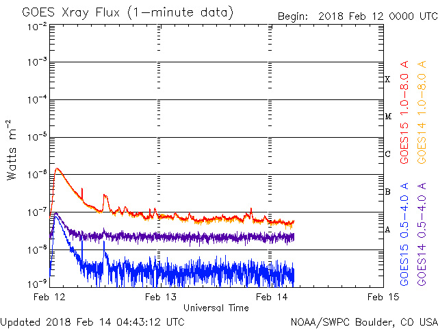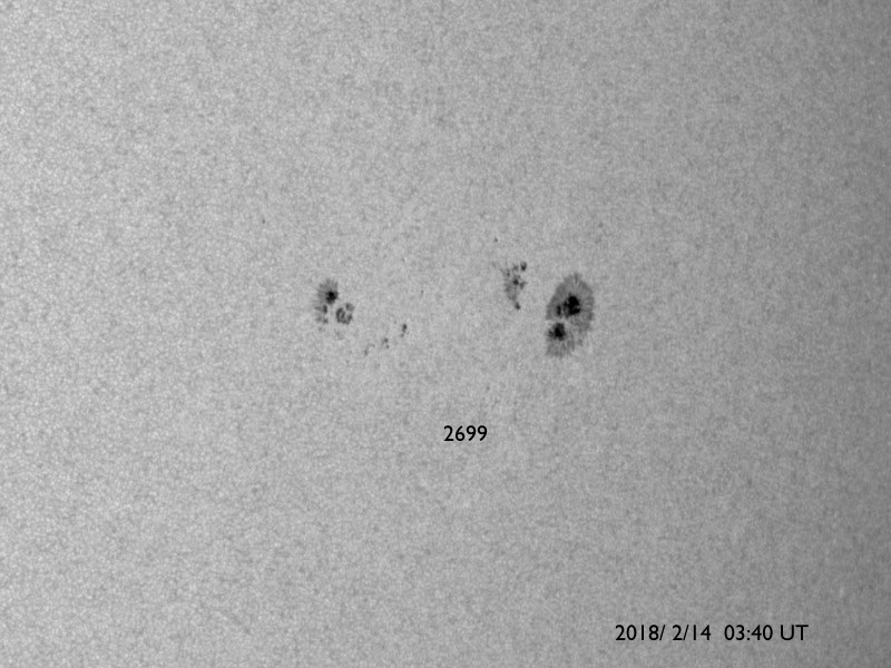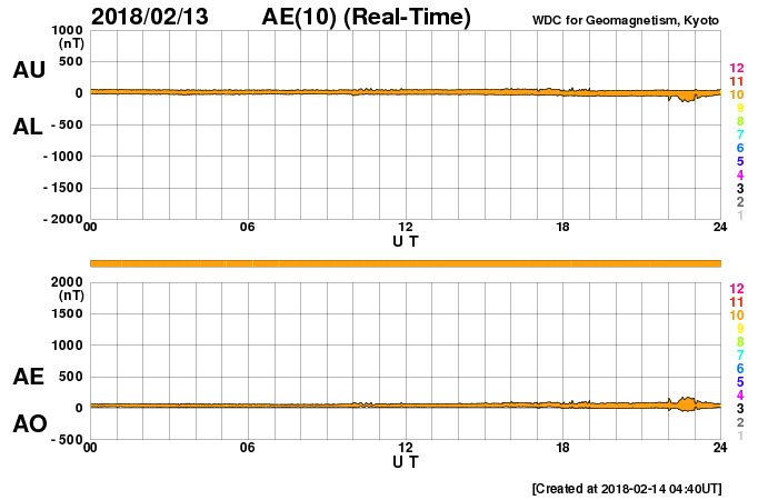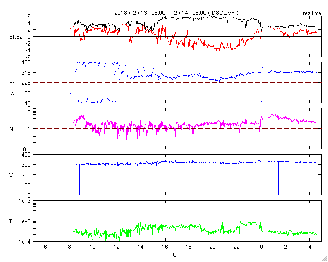 2018/ 2/14 13:43 更新 太陽風は低速です。今後、CMEの乱れが到来しそうです。 担当 篠原 2699黒点群は、衰え始めている様で、 拡大写真では、黒点が小さくなり、 X線グラフは、全体の強度が低下しています。 太陽はこのまま穏やかになりそうです。 太陽風は、320km/秒と低速の風が続いています。 磁場強度は、3nTから5nTに上がり、 再び3nTに下がるという変化をしていますが、 振れ方としては小幅で、 磁気圏では特に変化は起きていません。 AE指数はほとんど変化がなく、穏やかな状態が続いています。 12日の朝に発生したCMEの影響が近付いています。 NOAA/SWPCの太陽風予報では、 今夜くらいに変化が到来するとしています。 変化の到来まで3〜4日程度と考えると、明日前後となりそうです。 今夜以降の太陽風の推移に注目して下さい。 太陽風の磁場が強まり、南向きに大きく変化すると、 磁気圏の活動も高まります。 オーロラのライブカメラにも注目して下さい。 一方、SDO衛星AIA193では、 三角形のコロナホールが太陽の中央部に広がっています。 明後日以降は、この領域の影響も始まりそうです。 ![]() 2699黒点群の拡大写真。SDO衛星。 (c) SDO (NASA)、作図:宇宙天気ニュース ![]() SDO衛星のAIA193カメラによる太陽コロナの様子 (c) SDO (NASA) ![]() SDO衛星による太陽の可視光写真。マウスの矢印を写真に重ねると、黒点番号付きの写真に切り替わります。 (c) SDO (NASA) ![]() GOES衛星の太陽X線データ (c) NOAA/SWPC ![]() DSCOVRが観測した太陽風の磁場(1番上の枠、黒線は全体の強度、赤線は南北成分) および、太陽風の密度(3番目の紫線)、速度(4番目の青線) (c) データ:NOAA/SWPC、作図:宇宙天気ニュース ![]() AE指数(速報値) 下段のAEグラフの値が高くなると、オーロラ活動が活発化しています。 (c) 京都大学WDC ![]() ![]() 27日の太陽周期に合わせたデータプロット 太陽が同じ面を地球に向けていた27日前の変化から、今後を予想することができます。 (c) 作図:宇宙天気ニュース