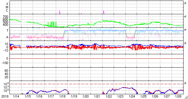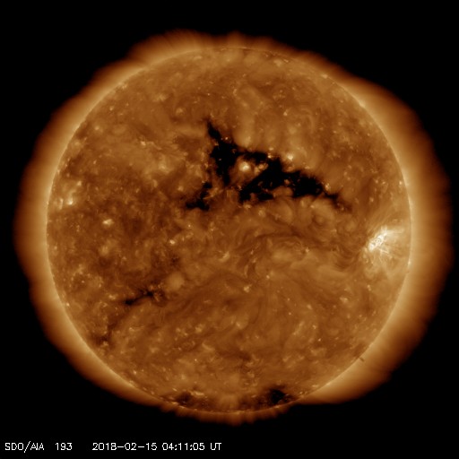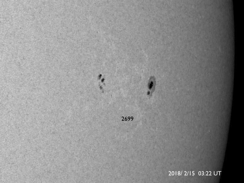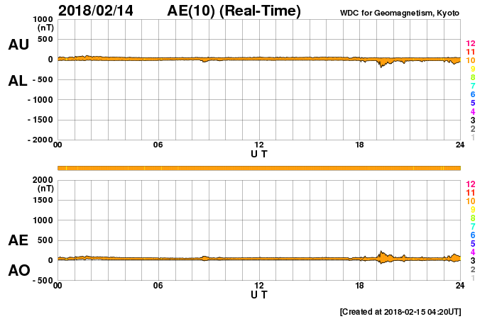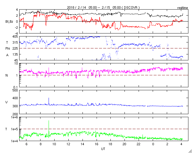 2018/ 2/15 13:22 更新 太陽風は低速で、変化は始まっていません。アイスランドのオーロラをどうぞ。 担当 篠原 一週間前になりますが、2月8日に、 アイスランド北部のHrisey島で撮影されたオーロラの写真を、 Songhiさんよりいただきました。 この頃の太陽風は、速度、磁場強度とも平均的な状態で、 磁気圏の活動も穏やかだったのですが、 アイスランドの夜の時間帯に、磁場が南寄りに振れて、 小規模ですがオーロラの活動を起こしたようです。 時間帯が同じかは分かりませんが、 ノルウェー・トロムソの全天カメラでも、 オーロラの活動が撮影されています。 Songhiさんによると、 現地のオーロラ予報サイトの期待レベルは0だったそうで、 厳しい条件の中、見事にオーロラの輝きを捉えた写真です。 どうもありがとうございます。 現在の太陽風は、速度は300km/秒に下がり、 更に低速になっています。 磁場強度も、 2nTに弱まっています。 太陽風磁場の南北成分は、 振れ幅は小さいですが、 グラフの後半から南寄りに変化しています。 速度が遅いこともあり、 AE指数のグラフは目立った変化にはなっていませんが、 ノルウェー・トロムソの全天カメラを見ると、 弱いオーロラの活動も発生しているようです。 12日のCMEの噴出から3日が経ち、 そろそろ乱れが到来するかもしれません。 今後の太陽風の変化に注目して下さい。 太陽では、2699黒点群が西の端に近付いています。 活動は穏やかで、可視光写真の姿もだいぶ寂しくなってきました。