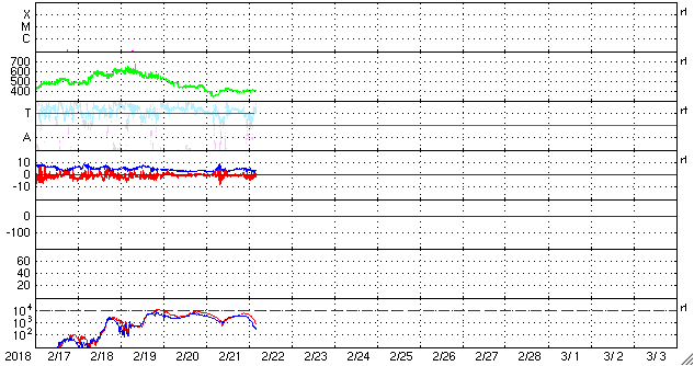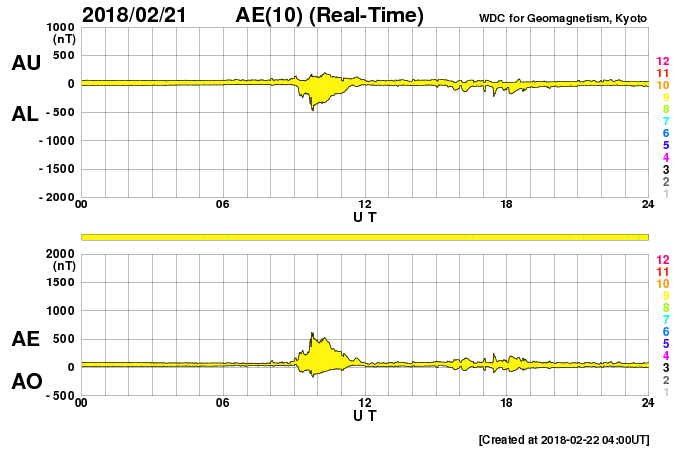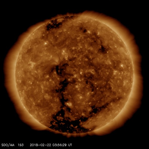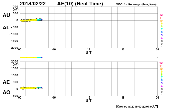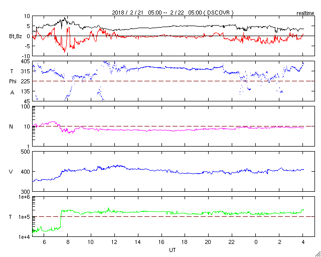 2018/ 2/22 13:16 更新 太陽風は平均的な速さです。太陽は無黒点で穏やかです。 担当 篠原 昨日のニュースの後に、 太陽風の小規模の乱れがやって来て、 磁場強度は3nTから8nTへ強まり、 速度は350km/秒から400km/秒へ少し高まりました。 磁場が強まった頃、南北成分は南へ大きく振れて、 最大で -8nTまで強まっています。 この影響で磁気圏の活動も一時的にやや高まり、 AE指数には、500nTの中規模の変化が発生しています。 この他は、磁場の南北成分は0nT付近と小さく、 AE指数の変化も見られなくなっています。 現在の太陽風の速度は、400km/秒と平均的な状態です。 27日周期の図では、前周期の太陽風は、 この後速度が少し高まるものの(1月26日)、 その後は低速の風になっています。 今回は、SDO衛星AIA193で淡いコロナホールの広がりが見えていて、 この影響がどうなるか注目して下さい。 放射線帯の高エネルギー電子は、 太陽風が落ち着いたため減少が続いています。 太陽は、無黒点で静穏です。