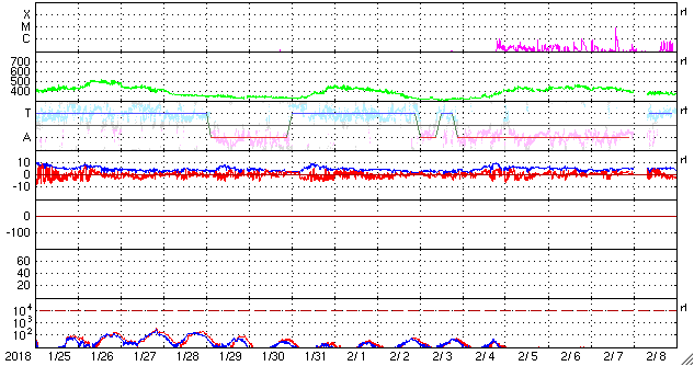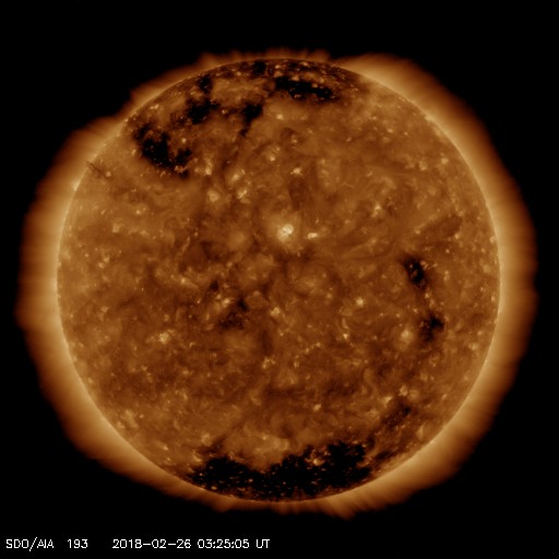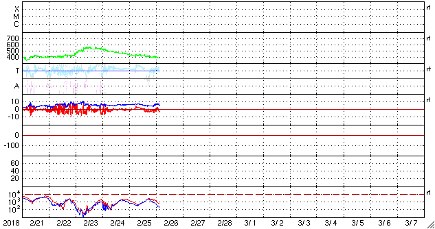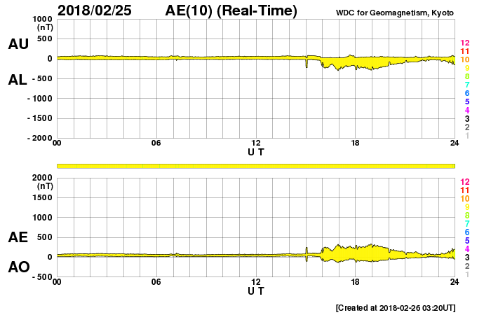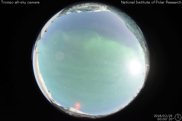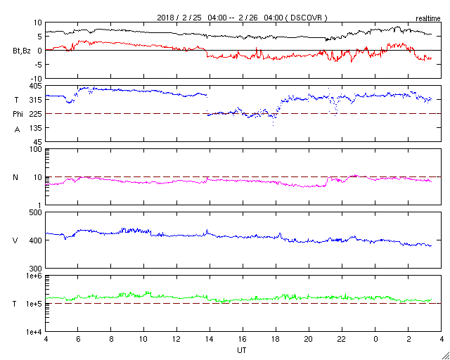 2018/ 2/26 12:31 更新 太陽風は平均的な状態です。磁気圏で弱い活動が起きています。 担当 篠原 太陽風は、420km/秒から380km/秒へ少し速度が下がり、 平均的な速さの風が続いています。 磁場強度も、5〜7nTと平均に近い状態で推移しています。 SDO衛星AIA193に見えいていたコロナホールの影響は、 まだ始まっていません。 写真を見ると、 コロナホールは影響の始まる目安の位置に達しています。 今後の太陽風の変化に注目して下さい。 太陽風磁場の南北成分は、 グラフの前半は弱い北寄り、後半は弱い南寄りになっています。 磁気圏の活動もこれに対応して、 AE指数のグラフは、初めは全く変化がありませんが、 その後、小さい活動が見られる様になっています。 世界時26日0〜1時のオーロラの様子を、 ノルウェー・トロムソの全天カメラの動画で紹介します。 AE指数のグラフは小規模の変化ですが、 全天カメラではきれいなオーロラが見えています。 太陽は、無黒点の状態が続いていますが、 SDO衛星AIA193の写真の中央部北側に、 小さく明るい領域が発生していて、 SDO衛星の可視光写真を拡大すると、 とても小さい黒い点が見えています。 「黒点」となるでしょうか。