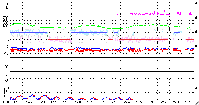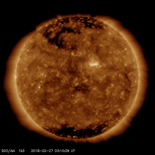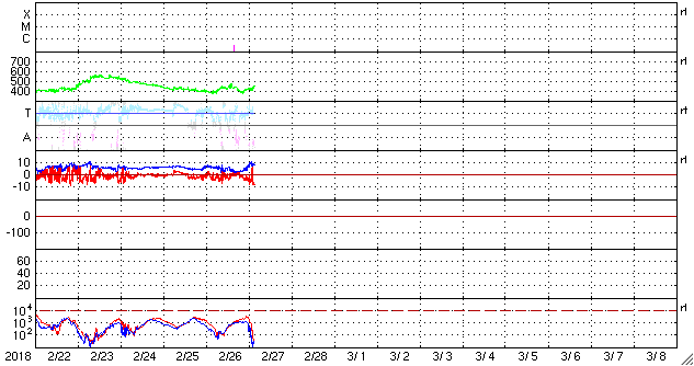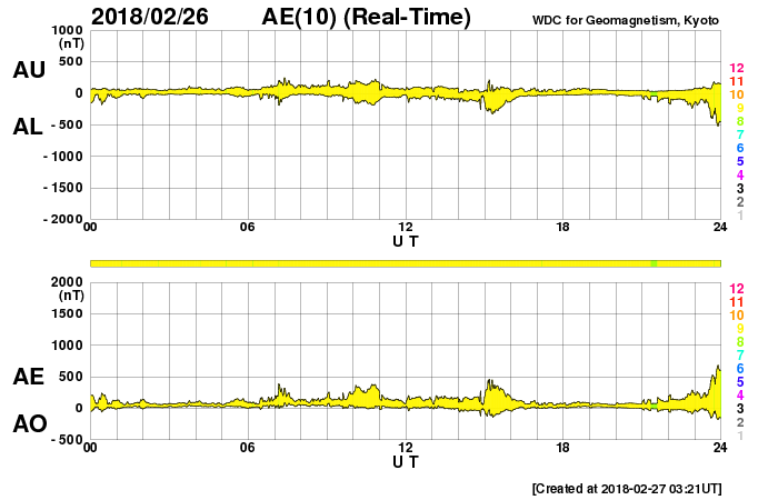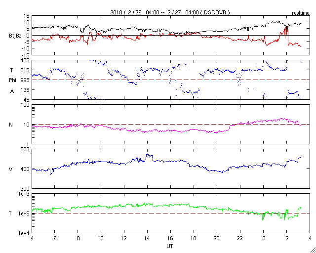 2018/ 2/27 12:21 更新 太陽風磁場が強まり、磁気圏の活動も高まっています。黒点が発生しました。 担当 篠原 今朝から、太陽風の磁場強度が強まり、 現在は10nTに達しています。 速度は、400〜430km/秒と平均的な状態が続いていましたが、 グラフの最後のところで450km/秒に上がりかけています。 更に高まって行くでしょうか。 27日周期の図を見ると、 前周期も1月31日に小さい速度の高まりが到来しています。 この時と同じタイミングで、 太陽風の高まりが始まっているのかもしれません。 注目していたコロナホールは、 SDO衛星AIA193の太陽写真では、 西の端にだいぶ近付いています。 影響があるなら、この辺りが最後のタイミングとなりそうです。 太陽風磁場の南北成分は、 磁場の強まりとともに南向きに強まりを見せています。 この影響で磁気圏の活動も高まり始めていて、 AE指数は500nTを少し超える位の変化になっています。 引き続き注目してください。 太陽では、昨日注目していた領域が発達して、 2700黒点群になっています。 前の黒点は、2月17日に沈んで行った2699群ですので、 10日ぶりの出現です。 X線グラフには、B3の小さい変化が発生しています。 B3に達する変化は2月16日以来で、 こちらも10日ぶりです。