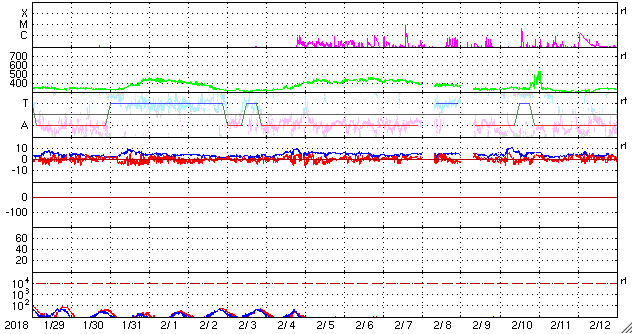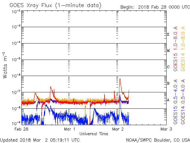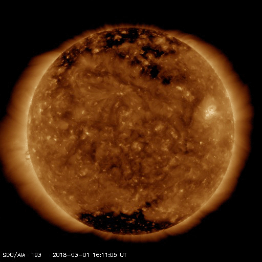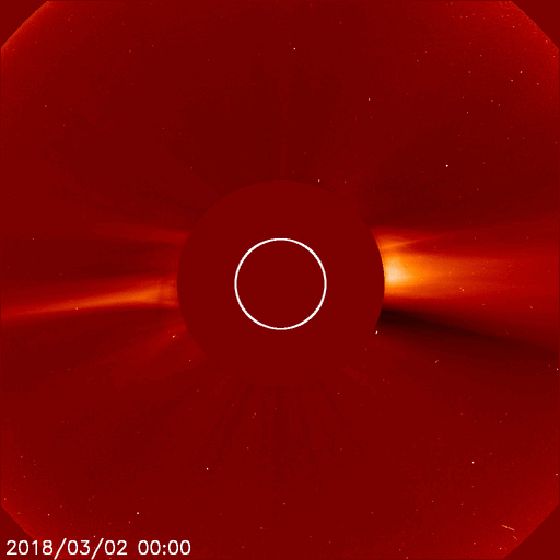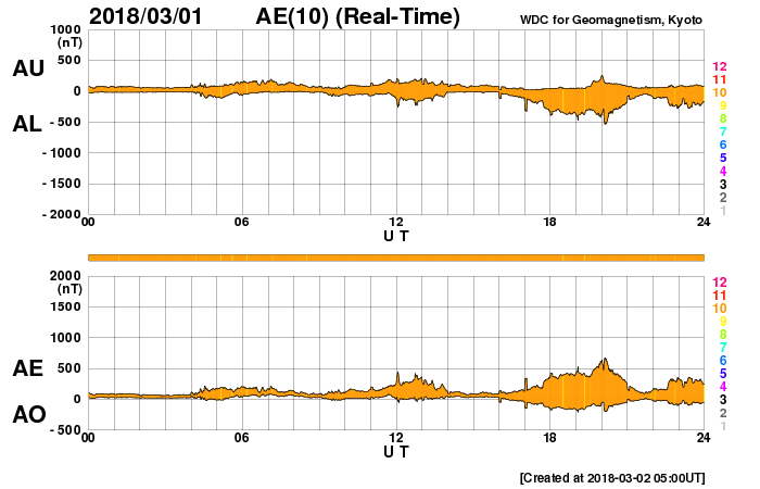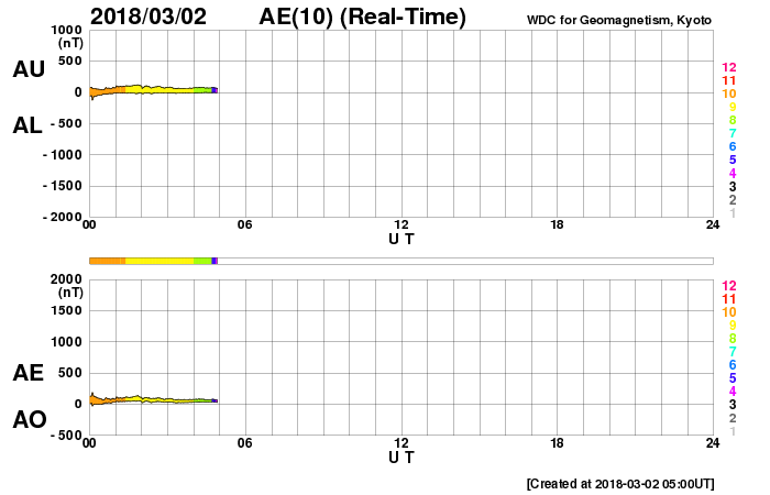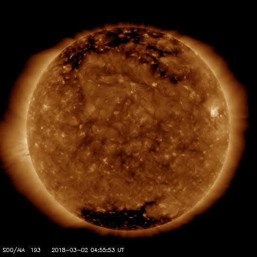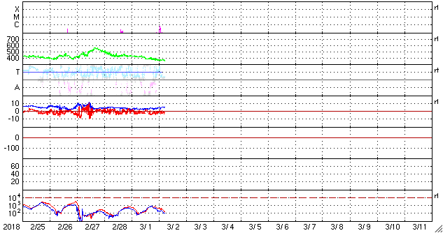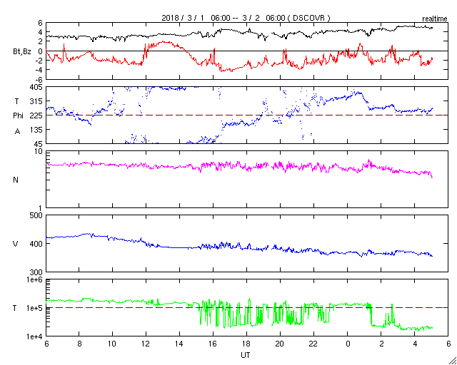 2018/ 3/ 2 14:11 更新 2700黒点群でB6.8の小さいフレアが起きました。 担当 篠原 2700黒点群は更に小さくなり、 掲載の可視光写真では、見つけられないくらいです。 この2700黒点群で、今朝、2日9時半(世界時2日0時半)に、 B6.8の小さいフレアが発生しました。 フレアの様子をSDO衛星AIA193の動画で紹介します。 Cクラス以下の小さい活動ですが、 静かになっている現在の太陽では貴重な変化です。 この動画でもコロナのガスが吹き飛ぶ様子を見ることができますが、 SOHO衛星LASCO C2では、 CME(太陽ガスの放出現象)の飛び始めを見ることができます。 地球からは横方向なので、影響は及ばないでしょう。 この後、2700黒点群が見えなくなると、 太陽は無黒点になりそうです。 太陽風の速度は、今日に入る頃に400km/秒を割り、 現在は360km/秒と低速の風になっています。 磁場強度は、3nTから5nTに少し上がり、 平均的な強度に戻っています。 27日周期の図を見ると、 27日前と同様の穏やかな風になってきた様です。 太陽風磁場の南北成分は、弱い南寄りになっていて、 AE指数では、300〜500nTの小規模の活動が発生しています。 現在は太陽風の速度が下がってきたので、 今後の活動は変化が小さくなりそうです。
