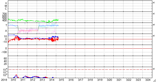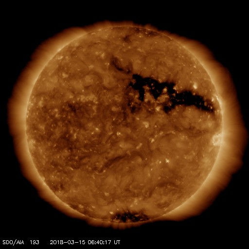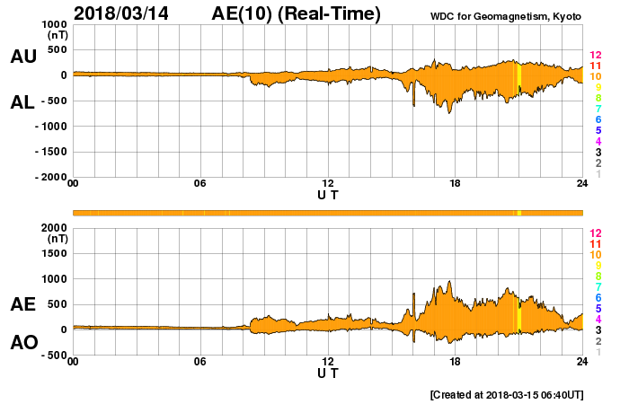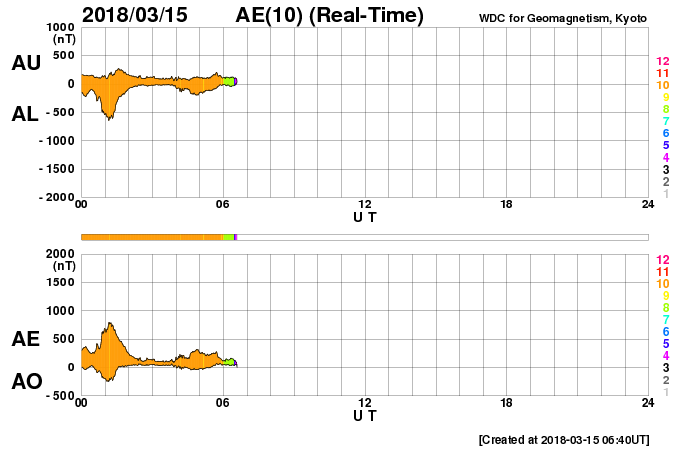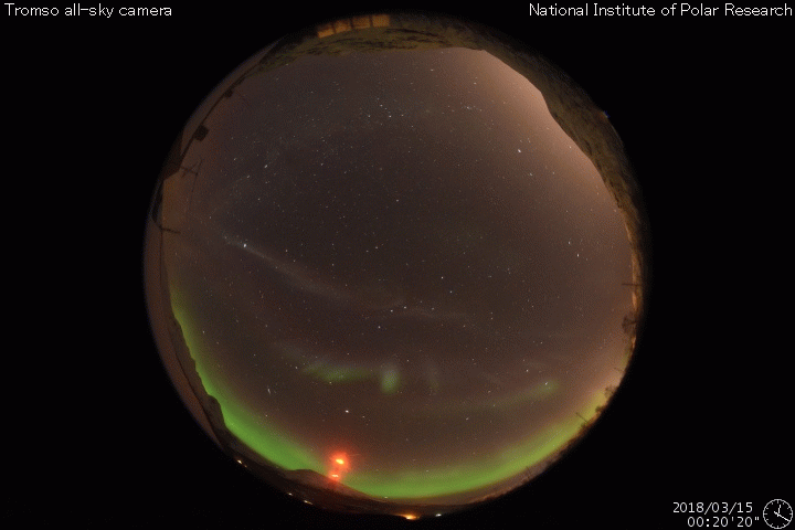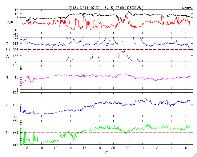 2018/ 3/15 15:47 更新 太陽風の高まりが到来し、磁気圏の活動も強まりました。 担当 篠原 昨夜から太陽風の高まりが到来しています。 磁場強度は、5nTから10nTへ強まりましたが、 速度は、320km/秒の低速の風が、 420km/秒と平均的な速さに高まる程度の弱い変化に留まっています。 SDO衛星AIA193の太陽コロナ写真に見えていた コロナホールの影響が始まった様です。 太陽風磁場の南北成分は、 磁場の強まりとともに南向きに大きく変化して、 -5〜 -10nTの変化が半日程度続きました。 このため、磁気圏の活動も高まって、 AE指数では、500nTから最大で1000nTに達する 中規模の活動が連続的に発生しています。 この変化の終わり頃にあたる、 世界時15日1時頃のオーロラの様子を、 ノルウェー・トロムソの全天カメラの動画で紹介します。 例年通りだと、 トロムソの全天カメラの観測は残り2週間程度です。 SDO衛星AIA193の写真では、 コロナホールは最後の部分(左端)が太陽の中央線を通り過ぎた頃です。 この後も、3〜5日程度太陽風の高まりは続く可能性があります。 現在の太陽風は、磁場の向きが北寄りに変わっていて、 磁気圏の変化は弱くなっています。 再び南向きに振れると、オーロラの活動も高まるでしょう。 太陽は無黒点で、穏やかな状態です。 研究会は今日で終わり、これから鹿児島に戻ります。 雲が次第に厚くなっていて、この後、雨になりそうです。 ![]() ノルウェー・トロムソの全天カメラで、世界時15日1時頃に撮影されたオーロラ。 (c) 国立極地研究所、(動画加工 : 宇宙天気ニュース) ![]() SDO衛星のAIA193カメラによる太陽コロナの様子 (c) SDO (NASA) ![]() SDO衛星による太陽の可視光写真 (c) SDO (NASA) ![]() DSCOVRが観測した太陽風の磁場(1番上の枠、黒線は全体の強度、赤線は南北成分) および、太陽風の密度(3番目の紫線)、速度(4番目の青線) (c) データ:NOAA/SWPC、作図:宇宙天気ニュース ![]() AE指数(速報値) 下段のAEグラフの値が高くなると、オーロラ活動が活発化しています。 (c) 京都大学WDC ![]() ![]() 27日の太陽周期に合わせたデータプロット 太陽が同じ面を地球に向けていた27日前の変化から、今後を予想することができます。 (c) 作図:宇宙天気ニュース
