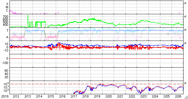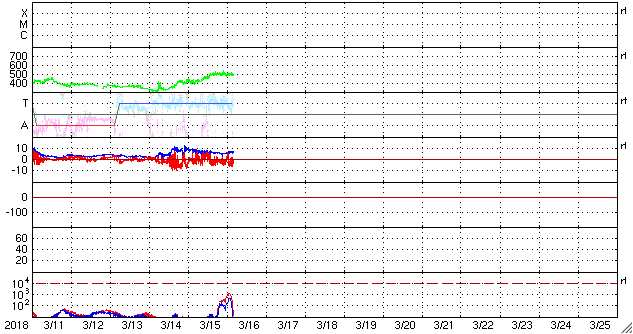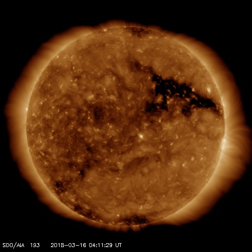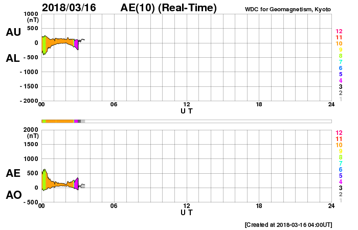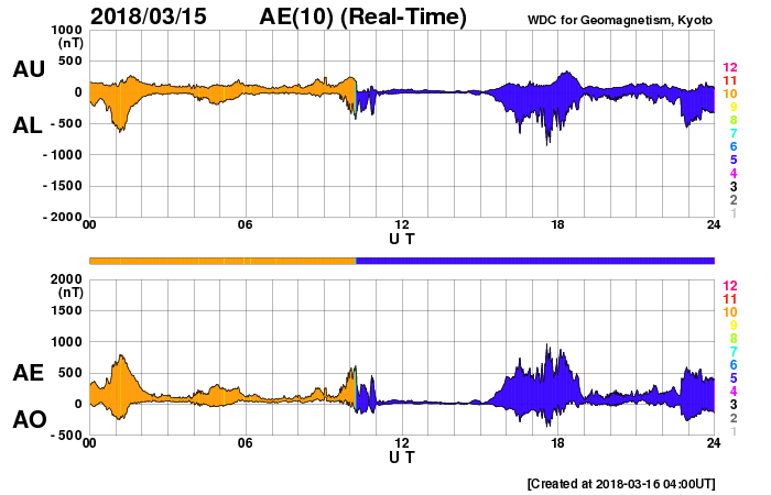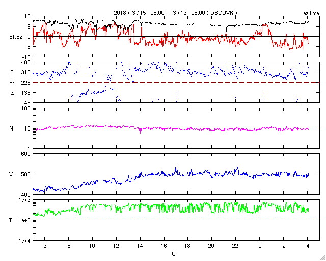 2018/ 3/16 13:19 更新 太陽風は高速の風になり、磁気圏の活動も続いています。 担当 篠原 太陽風の速度は、昨日の夕方から更に高まり、 深夜には、500km/秒と高速の状態に達しました。 コロナホールの影響はより強まっています。 太陽風は、現在もこの速さが続いています。 太陽風の磁場強度は、 5〜7nTと平均的な値を保っています 南北成分は、今日に入る頃から南寄りに傾向が変わり、 -3〜 -5nT程度の南向きが頻繁に発生しています。 この影響で、磁気圏の活動は高まった状態が続き、 AE指数のグラフでは、1000nTに達する大きな変化や、 500nT程度の中規模の変化が度々発生しています。 SDO衛星AIA193では、 コロナホールの先頭は、太陽の西側に沈んでいます。 太陽風の高まりは、後半に入っていくでしょう。 太陽は、穏やかな状態が続いています。 今日も無黒点です。 ![]() SDO衛星のAIA193カメラによる太陽コロナの様子 (c) SDO (NASA) ![]() SDO衛星による太陽の可視光写真 (c) SDO (NASA) ![]() DSCOVRが観測した太陽風の磁場(1番上の枠、黒線は全体の強度、赤線は南北成分) および、太陽風の密度(3番目の紫線)、速度(4番目の青線) (c) データ:NOAA/SWPC、作図:宇宙天気ニュース ![]() AE指数(速報値) 下段のAEグラフの値が高くなると、オーロラ活動が活発化しています。 (c) 京都大学WDC ![]() ![]() 27日の太陽周期に合わせたデータプロット 太陽が同じ面を地球に向けていた27日前の変化から、今後を予想することができます。 (c) 作図:宇宙天気ニュース