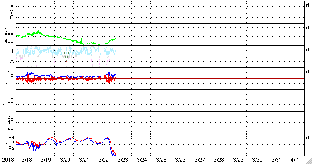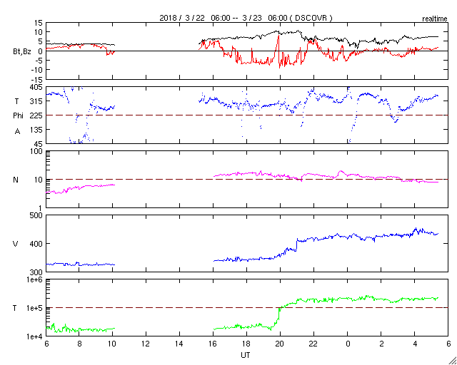 - 2018/ 3/22 16:46 低速の太陽風が続き、磁気圏も穏やかです。