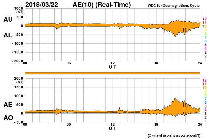 下段のAEグラフの値が高くなると、オーロラ活動が活発化しています。