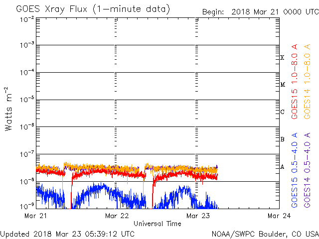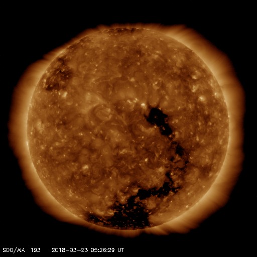 - 2018/ 3/18 11:37 500km/秒の高速太陽風が続いています。2702黒点群が発生しています。