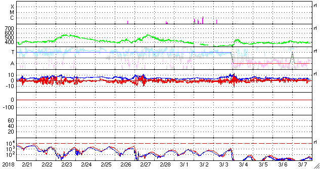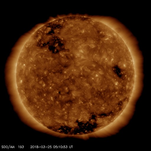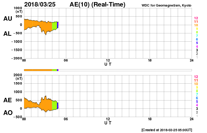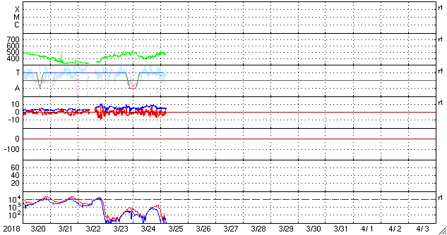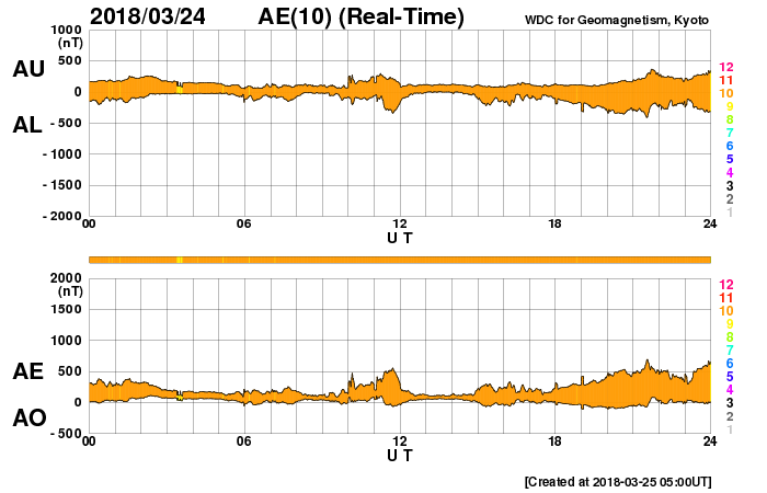 2018/ 3/25 14:16 更新 太陽風速度の高まりは続いています。磁気圏も活動的です。 担当 篠原 太陽風の速度は、 昨日の夕方にかけて400km/秒まで下がりましたが、 その後再び高まって、 今朝以降は、480km/秒と高速の状態に戻っています。 太陽風速度の高まりは、上下しながら続いています。 一方、磁場強度は、速度の変化と反対に、 5nTから10nTに高まり、 再び5nTに戻るという変化をしています。 南北成分は、比較的南向きに変化しています。 磁気圏の活動はある程度高まっていて、 AE指数は、500nT程度の中規模の変化が目立っています。 SDO衛星AIA193では、 太陽風の高まりをもたらしているコロナホールは 太陽の西の端に達しています。 この後、太陽風は穏やかな風に戻りそうです。 太陽は無黒点です。 X線グラフも変化は見られません。 ![]() SDO衛星のAIA193カメラによる太陽コロナの様子 (c) SDO (NASA) ![]() SDO衛星による太陽の可視光写真 (c) SDO (NASA) ![]() DSCOVRが観測した太陽風の磁場(1番上の枠、黒線は全体の強度、赤線は南北成分) および、太陽風の密度(3番目の紫線)、速度(4番目の青線) (c) データ:NOAA/SWPC、作図:宇宙天気ニュース ![]() AE指数(速報値) 下段のAEグラフの値が高くなると、オーロラ活動が活発化しています。 (c) 京都大学WDC ![]() ![]() 27日の太陽周期に合わせたデータプロット 太陽が同じ面を地球に向けていた27日前の変化から、今後を予想することができます。 (c) 作図:宇宙天気ニュース