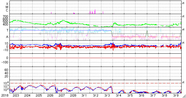 - 2018/ 3/22 16:46 低速の太陽風が続き、磁気圏も穏やかです。