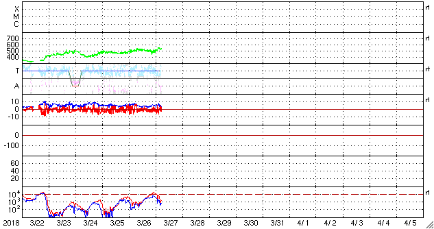 - 2018/ 3/25 14:16 太陽風速度の高まりは続いています。磁気圏も活動的です。