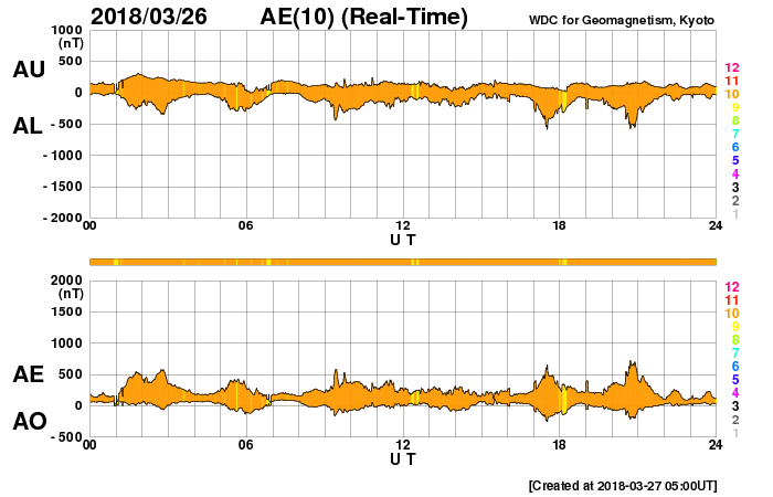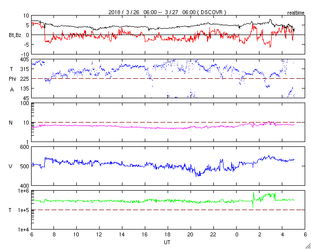 - 2018/ 3/26 13:58 太陽風は高まった状態が続き、磁気圏も活動的です。