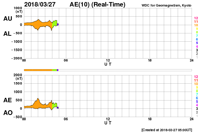下段のAEグラフの値が高くなると、オーロラ活動が活発化しています。