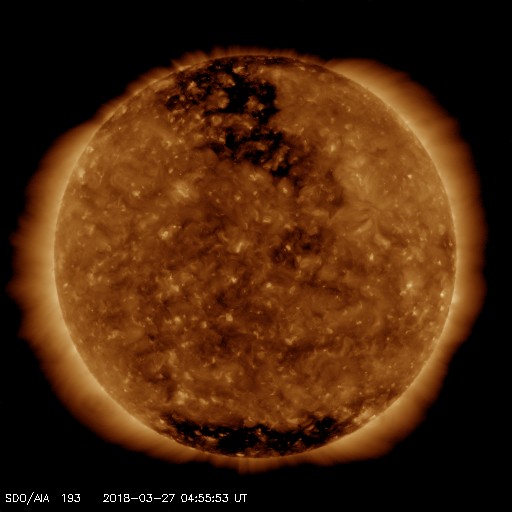 - 2018/ 3/24 11:50 太陽風の速度は500km/秒に高まっています。